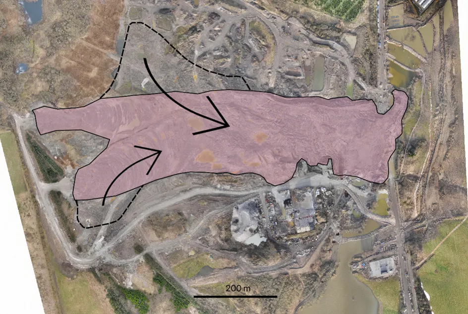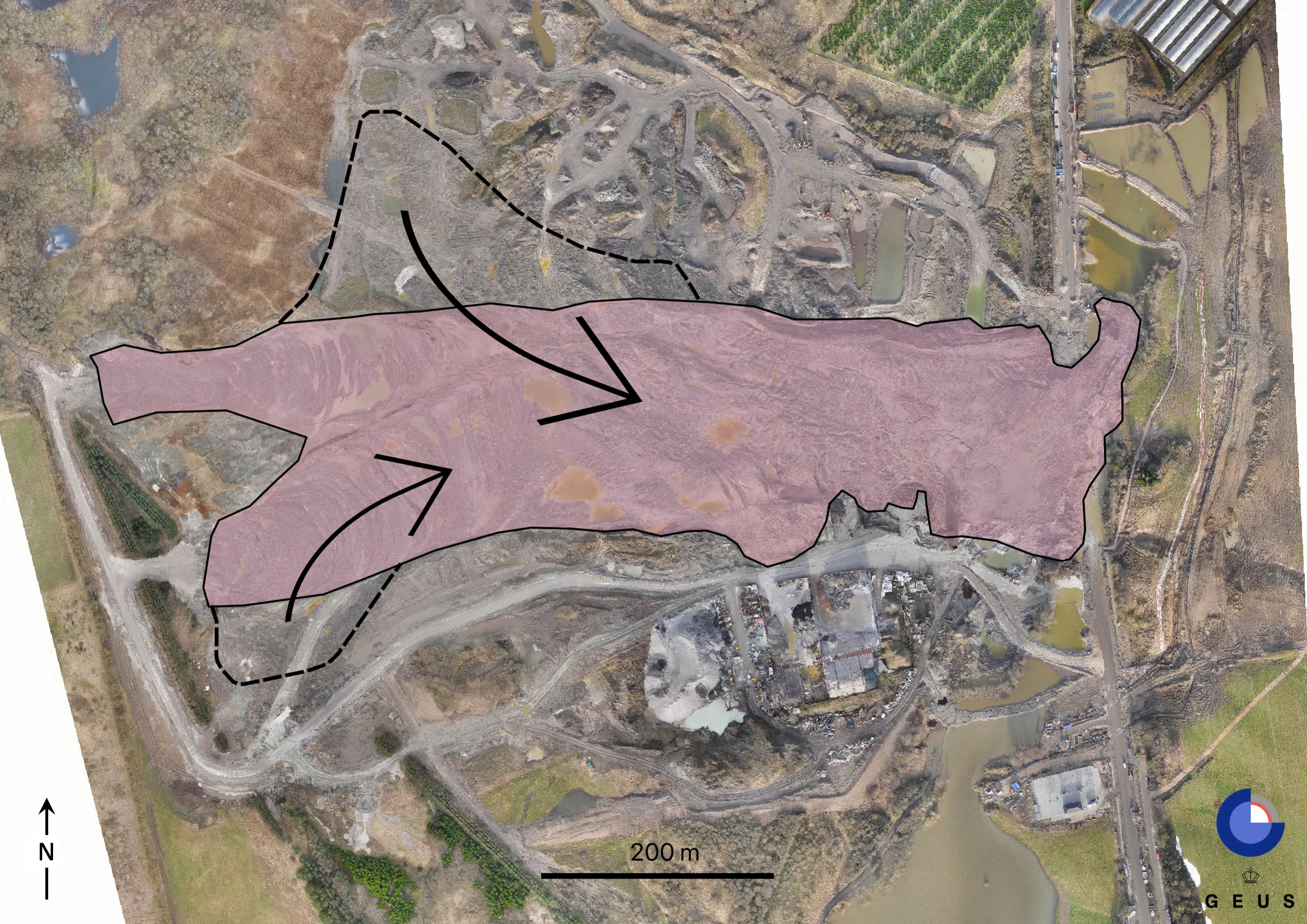 - Jordstrømmene har presset på den øvre vestlige del af den deponerede jord, som allerede var i bevægelse fra 2021 til foråret 2023. Jordskreddet består således i dag af to jordstrømme samt en stor del af den deponerede jord fra den centrale del af deponiet. Jordstrømmene er på 0,32 millioner kubikmeter og udgør dermed en fjerdedel af jordskreddets samlede volumen på 1,2 millioner kubikmeter.