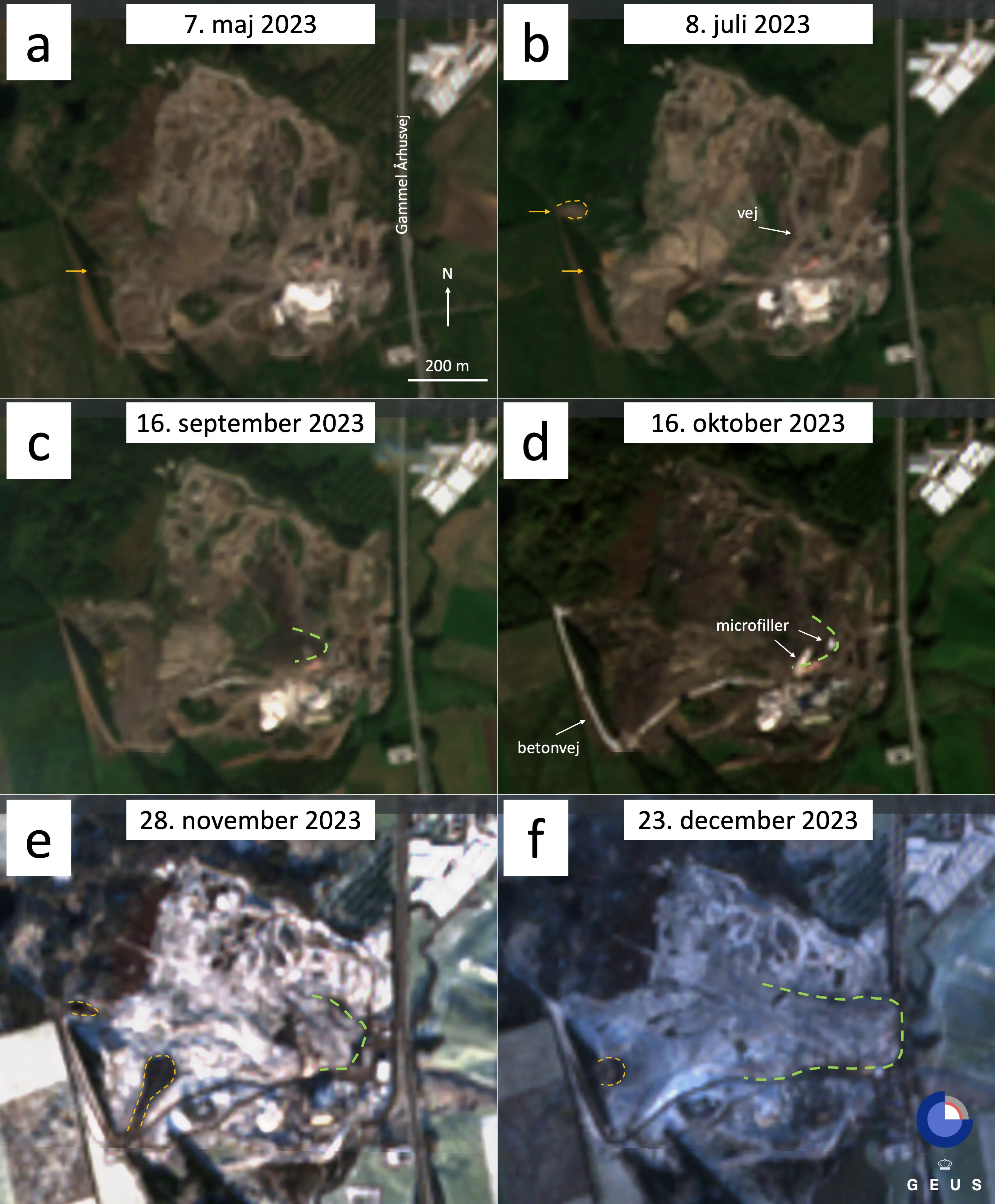 - Fra april 2023 og året ud bliver der læsset jord af fra kanten af den tidligere lergrav og ned på den 15° hældende vestlige skråning af lergraven. Aflæsningen af jord på den hældende skråning har dannet store strømme af jord, som har bevæget sig ned og ind i deponiet.