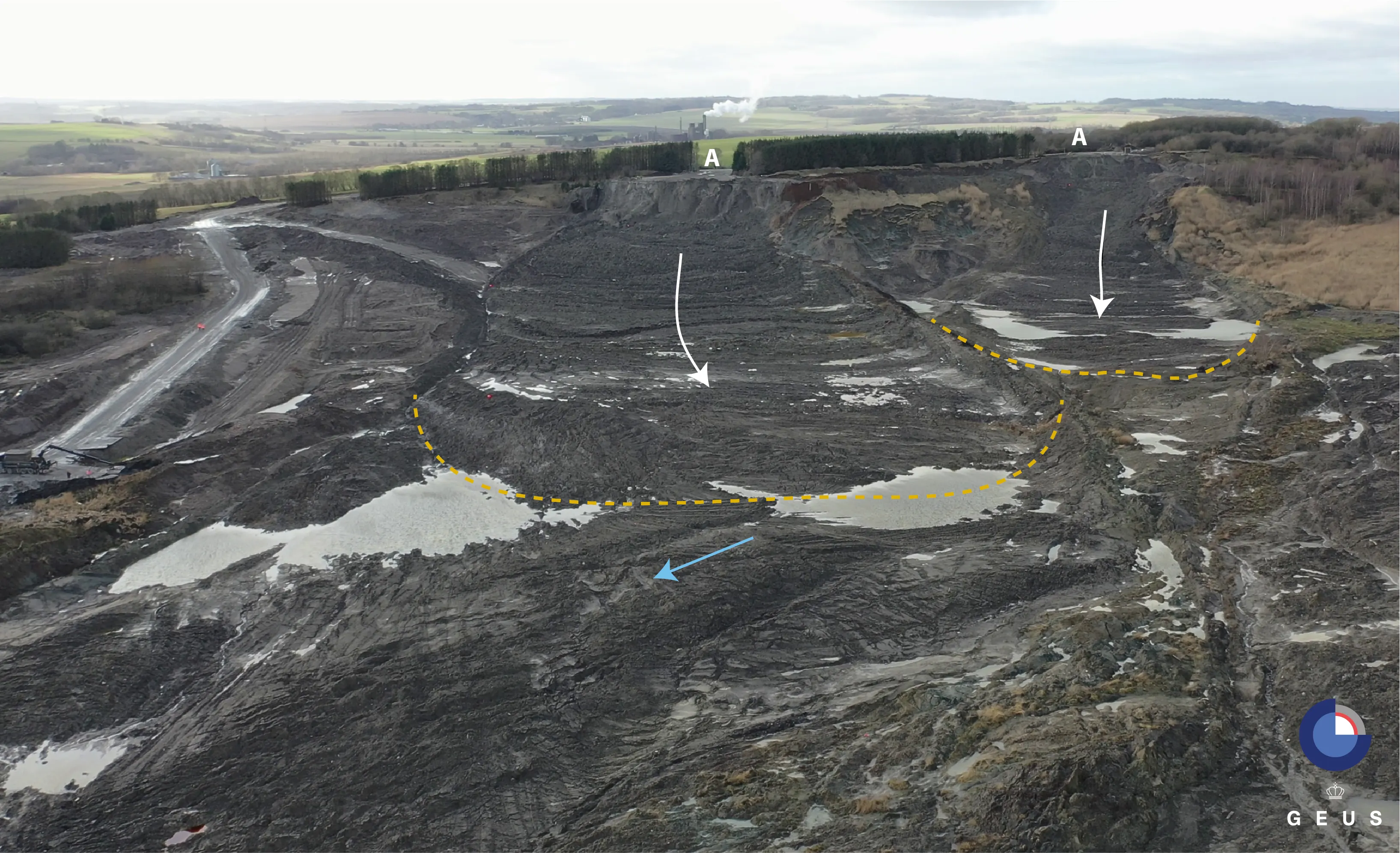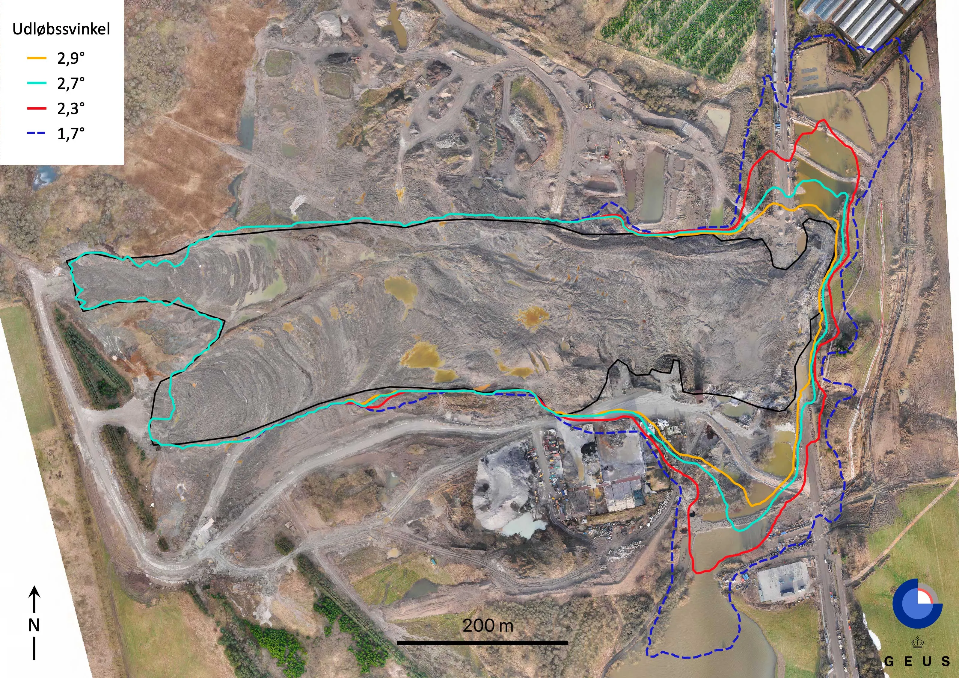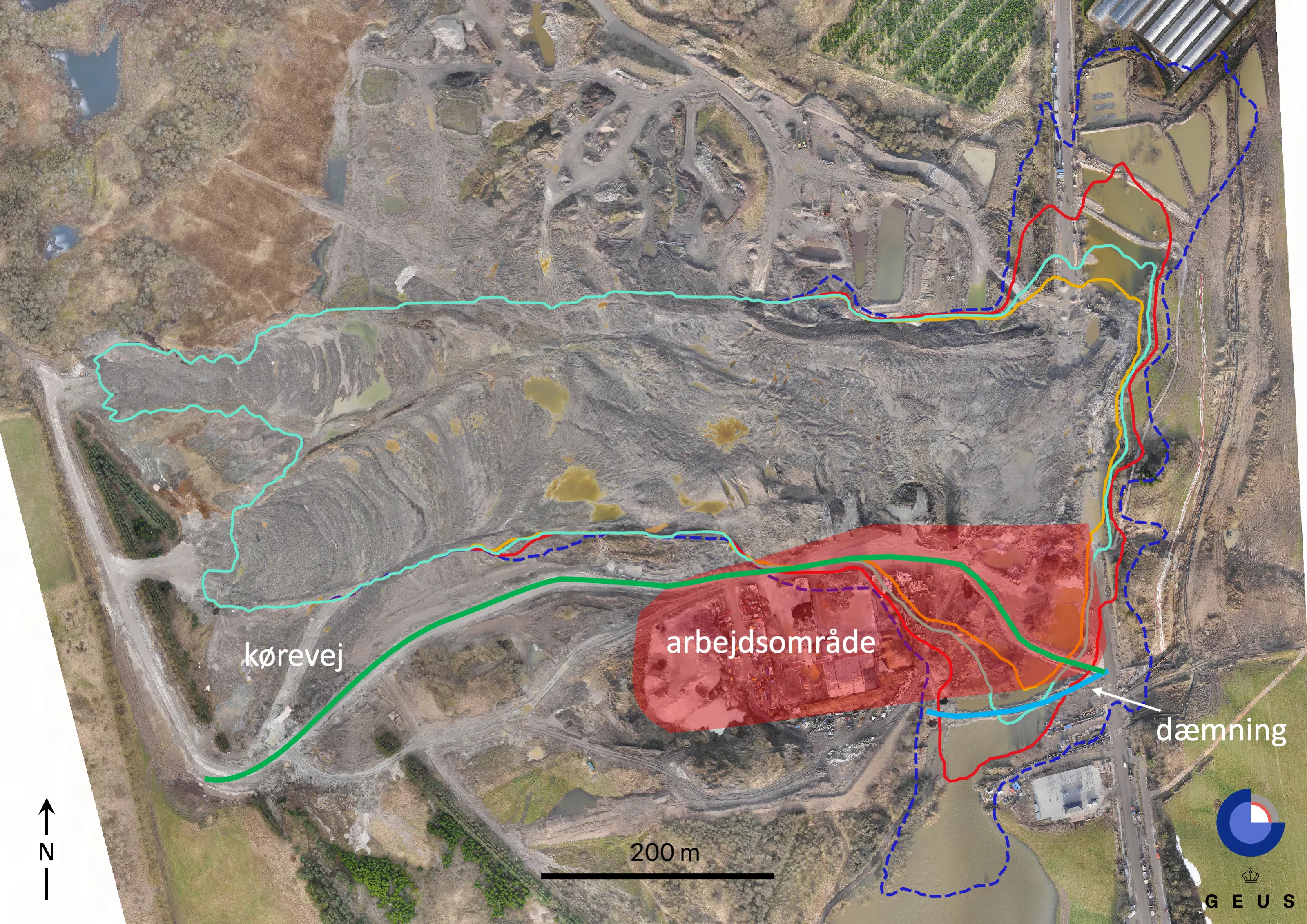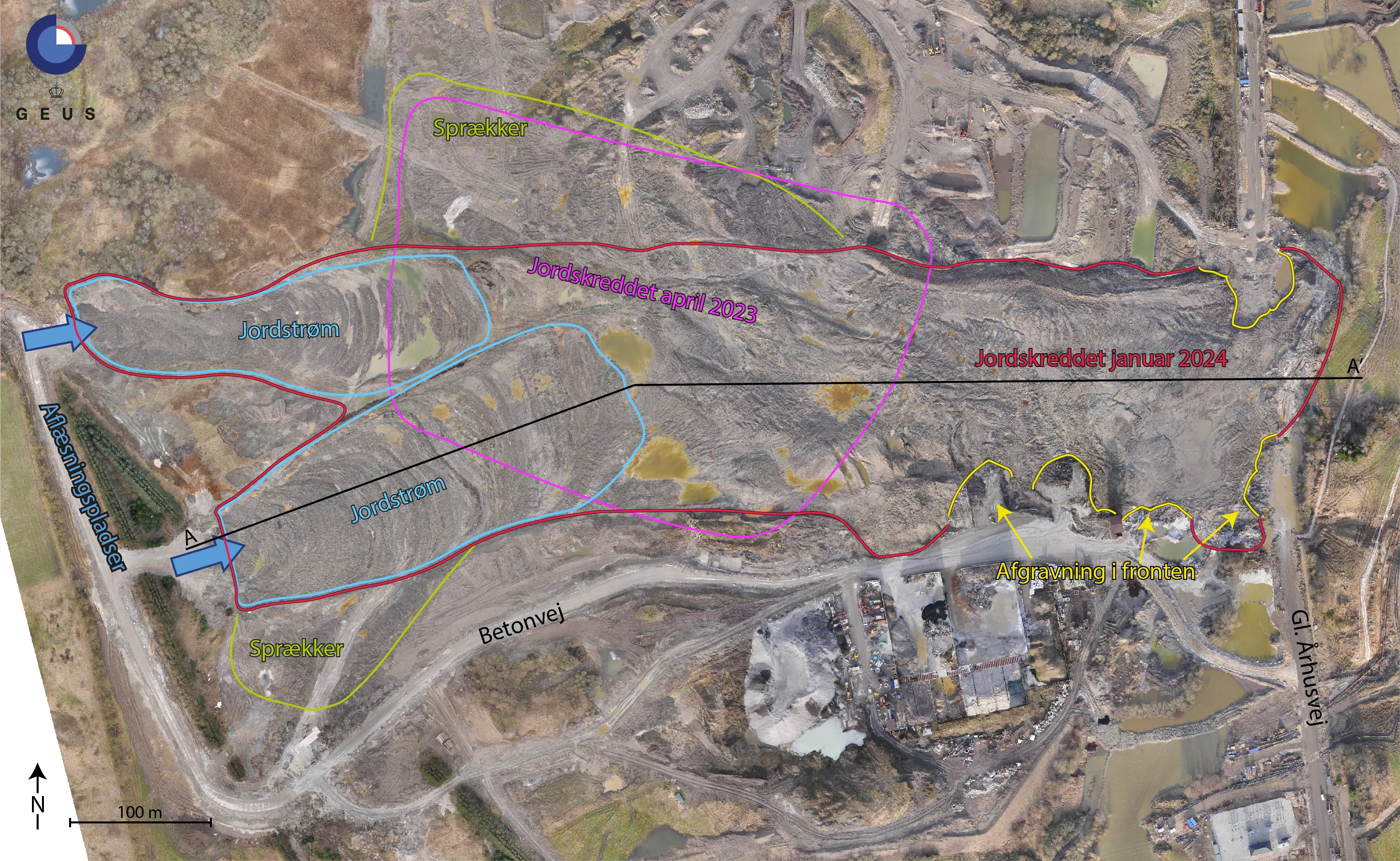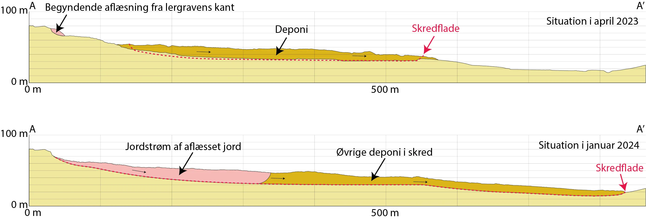 - GEUS vurderer, at jordskreddet ved Nordic Waste siden midten af 2023 er drevet frem af jordstrømme, som er dannet ved aflæsning af jord fra den vestlige skråning af den tidligere lergrav, en praksis som blev påbegyndt i april 2023 og fortsatte året ud. Det er således aflæsningen af store mængder jord fra lergravens kant, som har ført til den accelererede jordskredsaktivitet i sidste halvdel af 2023.