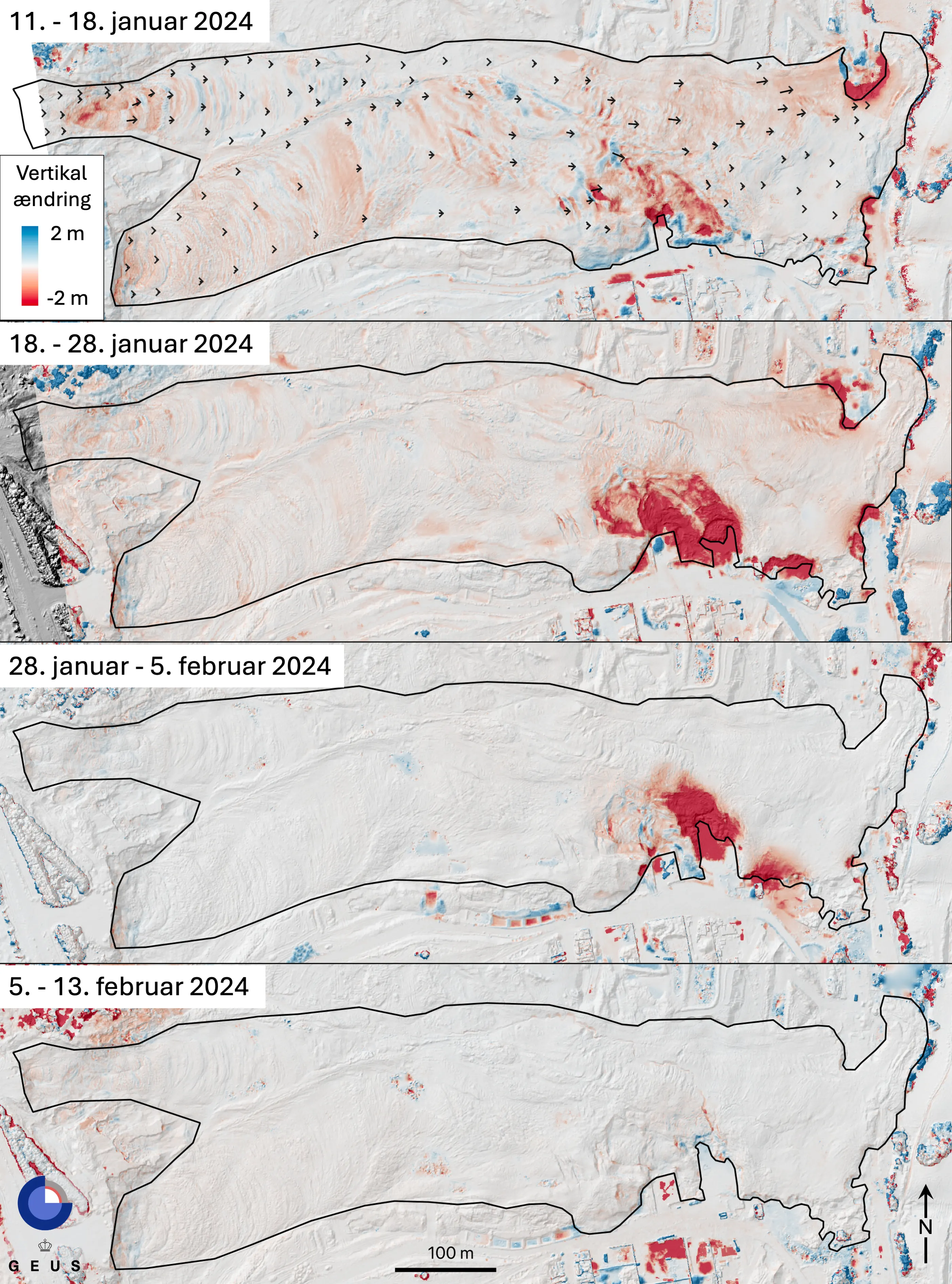 - Jordskreddets aftagende bevægelser i løbet af januar og februar 2024 tyder på, at det er ved at stabilisere sig. Hvis jordskreddet bevæger sig længere frem, vil det bevæge sig mod syd og mod nord.