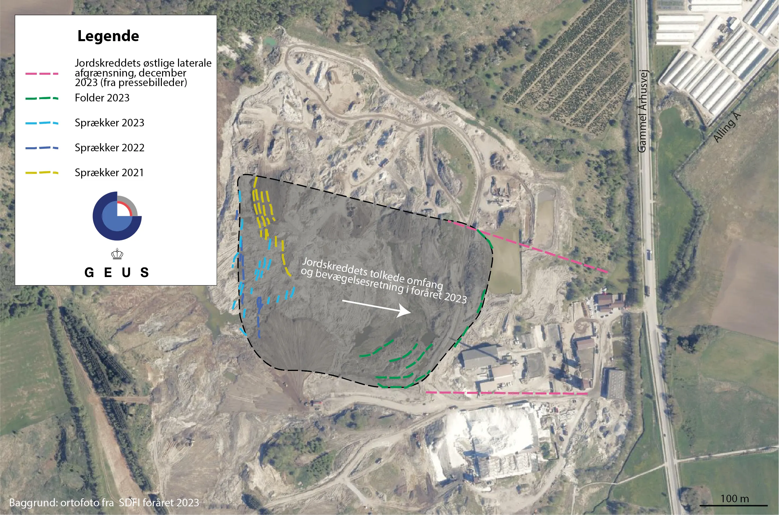 - I foråret 2023 ses ud fra fotos en betydelig jordskredsaktivitet i form af tydelige skredstrukturer i den deponerede jord samt påvirkning af området neden for skredtåen, hvilket blandt andet fører til ødelæggelse af en bygning. Jordskreddets areal er på dette tidspunkt ca. 90.000 m2.