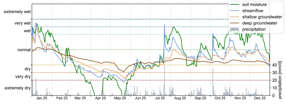 Som følge af de store nedbørsmængder i 2024 begyndte 2025 med overvejende normale til let våde forhold for vandføring, jordfugtighed og det øverste grundvand, mens det dybe grundvand lå omkring normalen. Dette ændrede sig dog hurtigt, da foråret 2025 blev usædvanligt tørt. Hydrologerne kan berette, at fra februar til maj lå indeksserierne konsekvent under normale værdier.