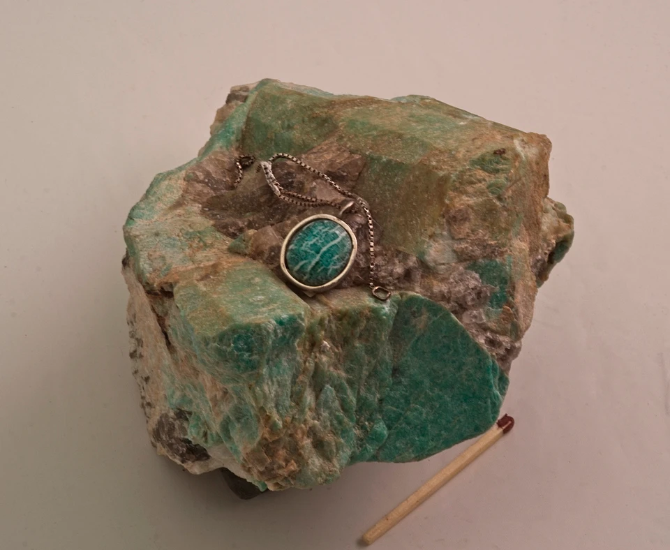 Stenen på billedet kommer fra forekomsten i Sydgrønland på nordkysten af Nunarsuit ca. 100 km vest for Qaqortoq. Her findes amazonit i tætte masser eller som nævestore krystaller i bjergarten pegmatit, som udfylder sprækker i områdets røde granit. Både pegmatit og granit er magmatiske bjergarter, dvs. at de består af smeltede stenmasser, der er størknet.