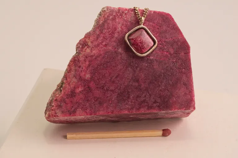 Spinelgruppens mineraler krystalliserer kubisk og har ofte veludviklede krystaller. Smykkestenen her er fra en lokalitet 40 km øst for Qeqertarsuatsiaat. Den består af en tæt bjergart af røde sukkeragtige korn af spinel og glimmermineralet phlogopit.
