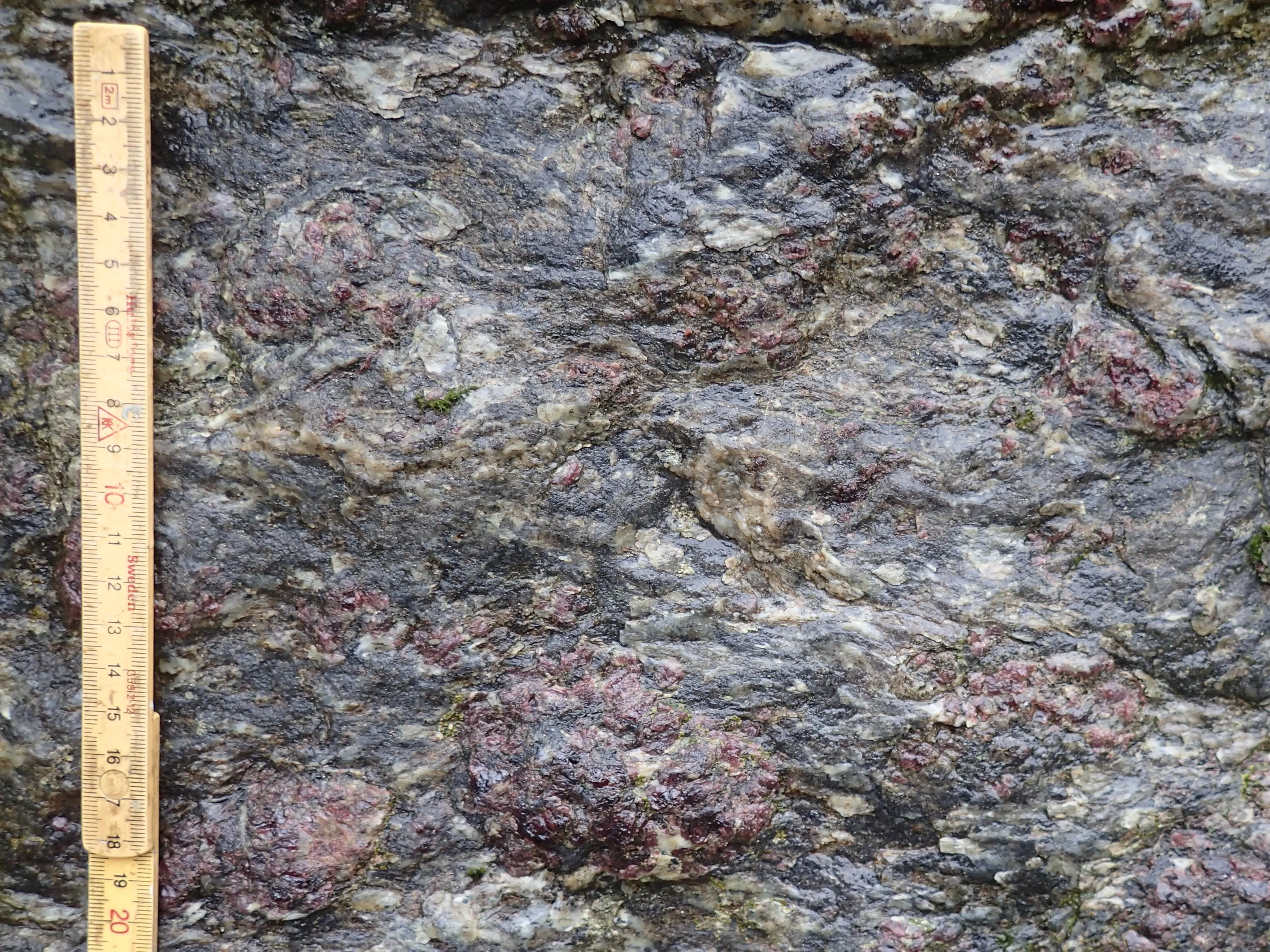 De lyse årer har granitisk sammensætning med feldspat og kvarts. Granat opstår ved metamorfose, hvor atomerne flytter sig og danner nye mineraler som reaktion på højt tryk dybt i jordskorpen. Diamant dannes på samme vis.