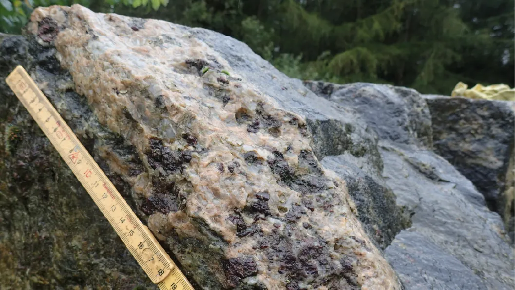 En stor del af det sydsvenske grundfjeld består af gnejs. Lignende kæmpesten af gnejs med granat ser du i Lundestenen på Lolland og Lommestenen i Isefjord.