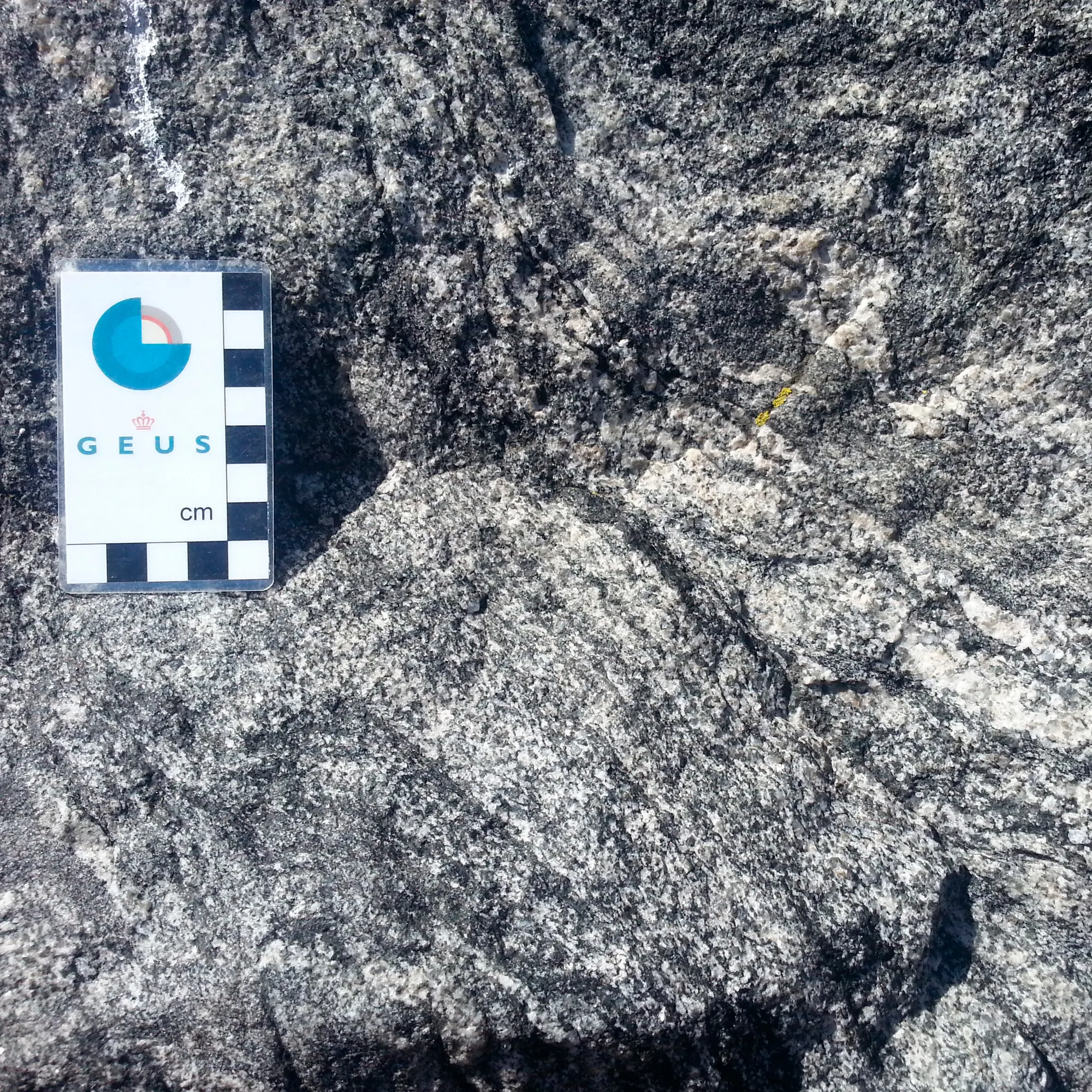To lodrette bånd præger stenen i midten. De består af en sort og fin- til mellemkornet bjergart. Bedste bud er bjergarten granodiorit. Granodiorit minder om granit men domineres af mineralerne kvarts og plagioklas og er næsten uden kalifeldspat.