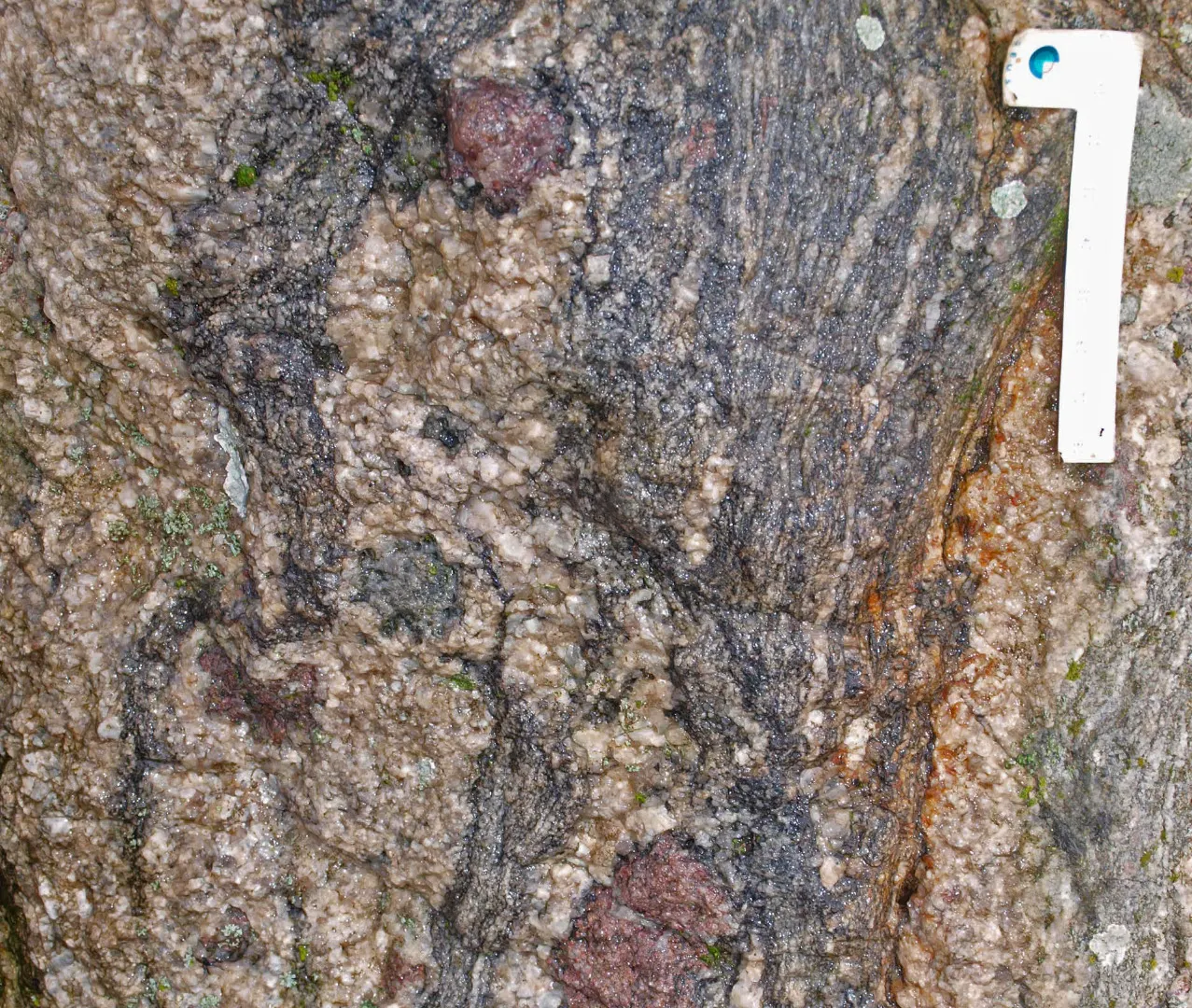På afstand ser Bolundstenen ensfarvet grå eller sort ud. Men når du kommer tæt på, viser den sig helt stribet og lagdelt. Sorte og lyse bånd veksler, ligesom tykkelsen på de enkelte bånd varierer fra millimeter til flere centimeter i bredde. Det stribede mønster afbrydes flere steder af et afrundet rødt mineral lidt ligesom knaster i et året fyrretræsbræt. Det røde mineral kaldes granat, og de største er flere centimeter store.