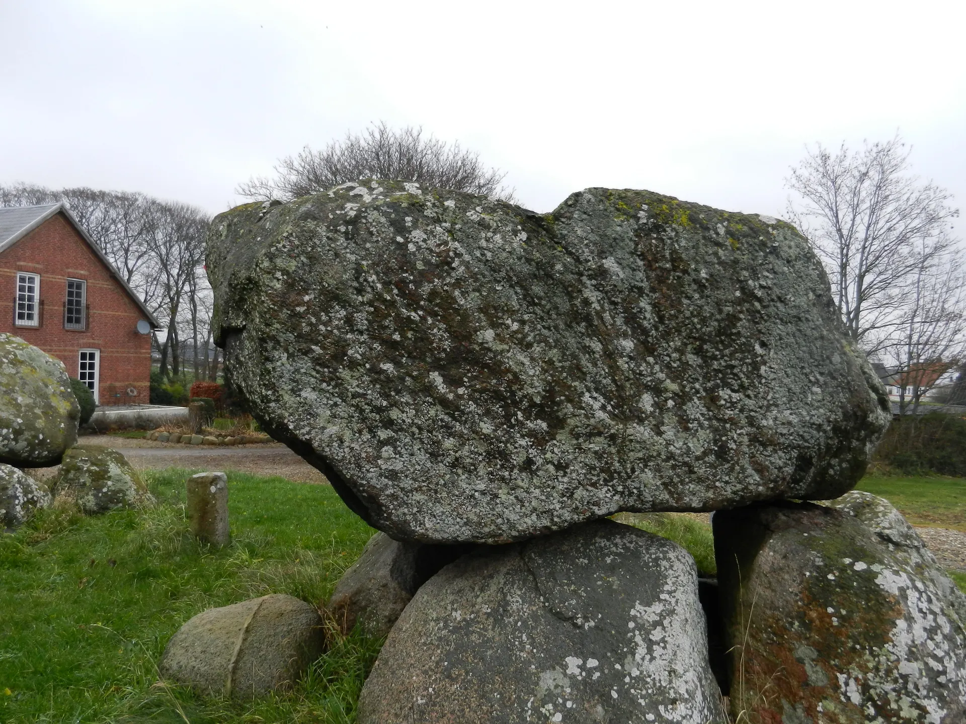 Stenen er temmelig overgroet med lav, hvilket gør det svært at skelne mineraler og strukturer. Men undersiden er uden begroning. Hvis du tør kravle ind i det snævre gravkammer og har en lommelygte med, kan du se gnejsens stribede fremtoning – foliationen – træde tydeligt frem. I lommelygtens skær ser du en migmatitisk gnejs, hvor højt tryk og temperatur har ført til delvis opsmeltning af bjergarten og dannet lyse bånd af feldspat og kvarts og mørke bånd domineret af det sorte glimmermineral biotit. Dybt i jordskorpen blev tryk og temperatur på et tidspunkt akkurat så høj, at kvarts og feldspat smeltede og krystalliserede igen i centimeterbrede årer. Under samme proces forarmedes de mørke bånd for samme mineraler. 'Migmatitisk' betyder blandingsbjergart.