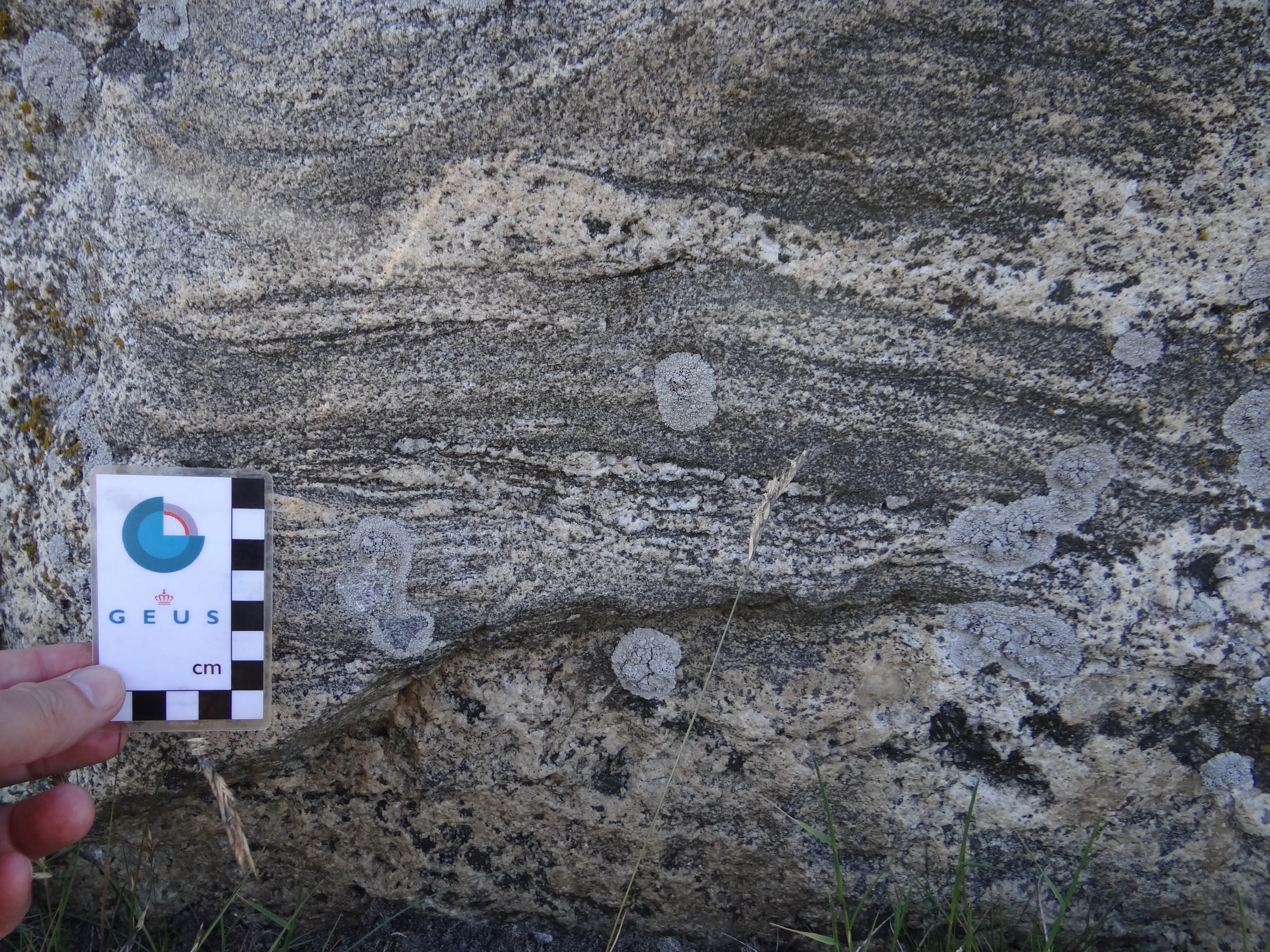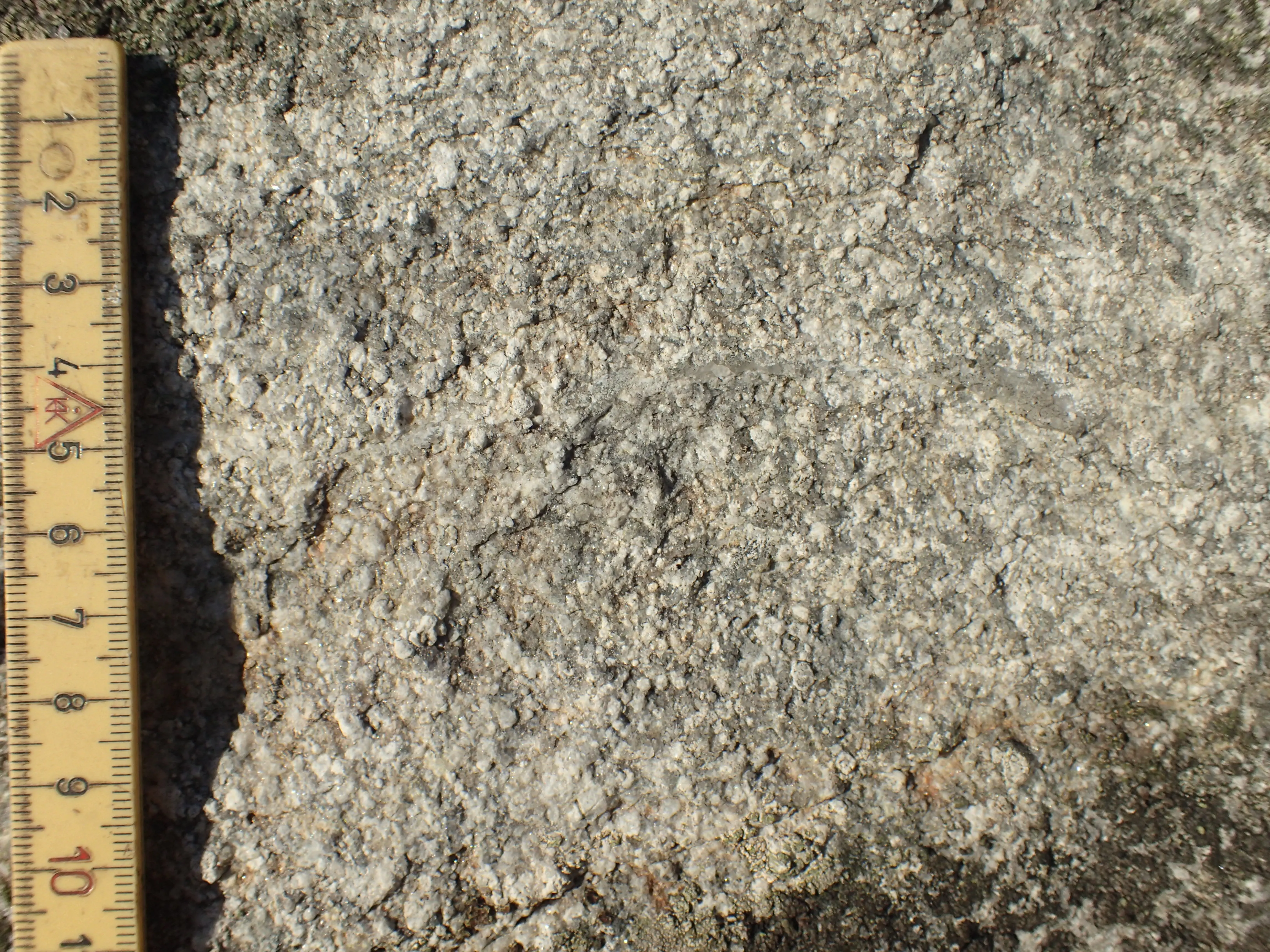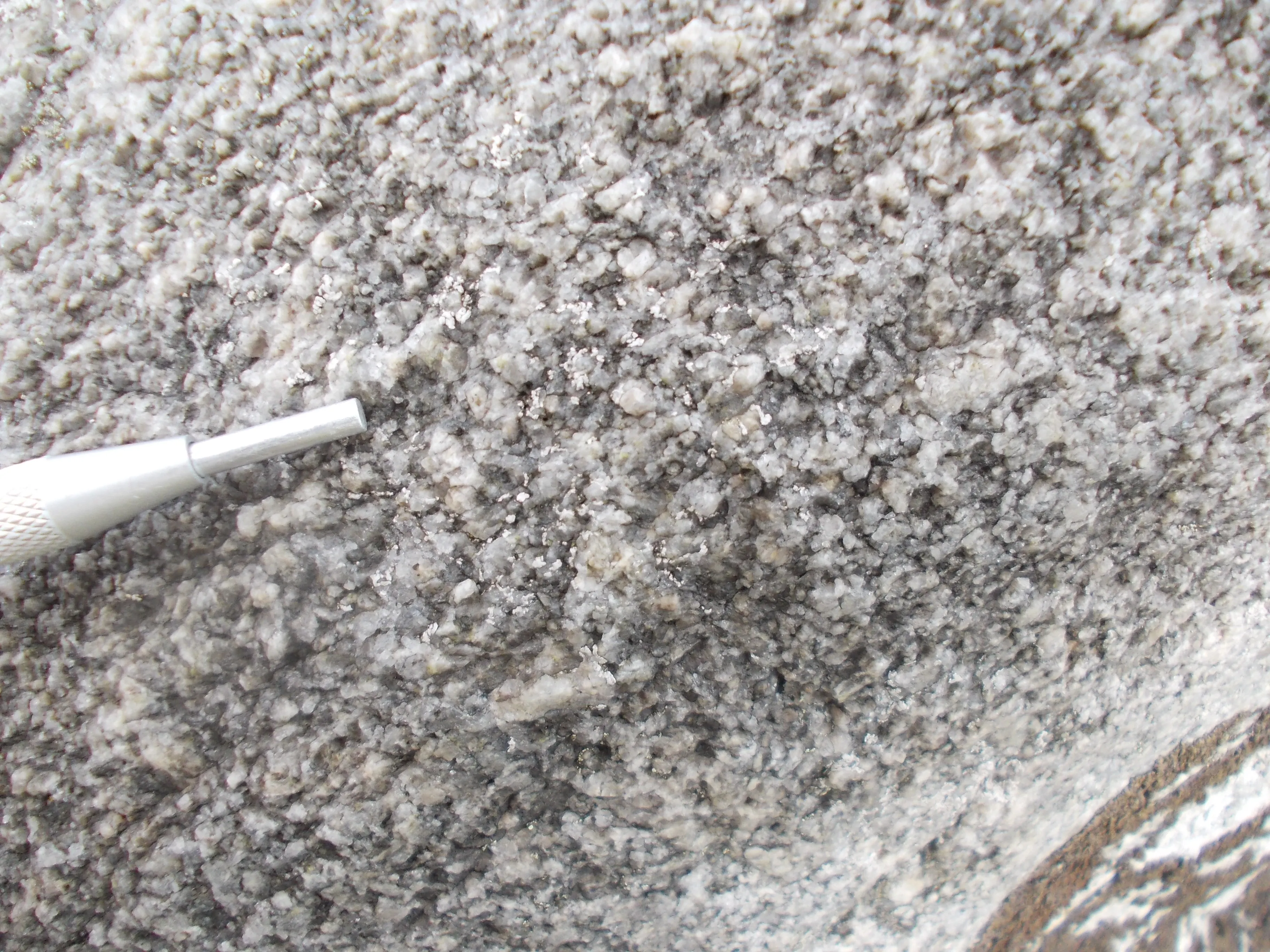Den pyramideformede kæmpe består af mellemkornet, næsten enskornet, lysegrå, umagnetisk granit. Enkelte tabulære feldspatkorn når størrelser op til 1 cm. Du ser dels hvidlig kalifeldspat og dels grålig plagioklas med tynde rande af kalifeldspat omkring. Kvartskorn putter sig ind imellem feldspatkornene.