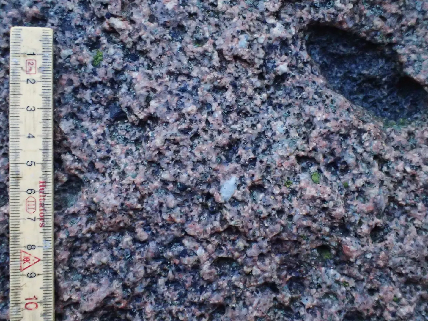 Udover striber har stenen også prikker. Rundt omkring ses indeslutninger af en mørkere bjergart i størrelsesordenen bordtennisbolde og tennisbolde. De optræder som rosiner i en bolledej. Da granitten var flydende og fyldte et magmakammer, smeltede granitlegemet sig op gennem jordskorpen. På sin vej tog det stumper med sig af det omkringliggende grundfjeld. Hvis de medrevne stumper ikke nåede at smelte, før granitten kølede af og størknede, kom stumperne til at indgå som små fremmedlegemer af ældre bjergart. Sådanne ældre indeslutninger kaldes xenolither.