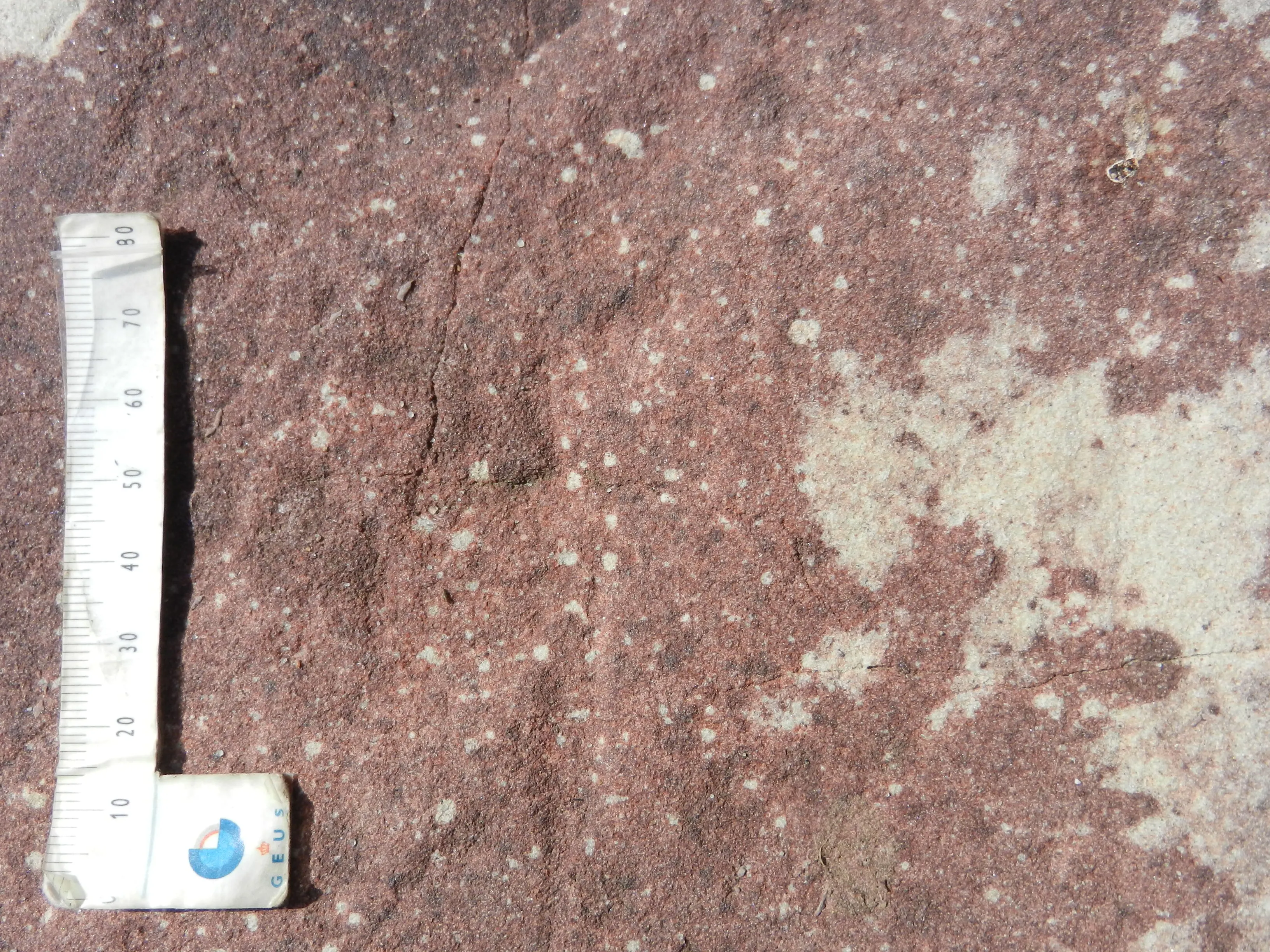 Den store blok sandsten på stranden ved Gedser Odde består af sammenkittet sand aflejret i en flod, der strømmede gennem en ørken – som Nilen gennem Sahara. Et enkelt sted på stenen ses revner og striber, der minder om skrålejringer, der er karakteristisk for et vandaflejret sediment.