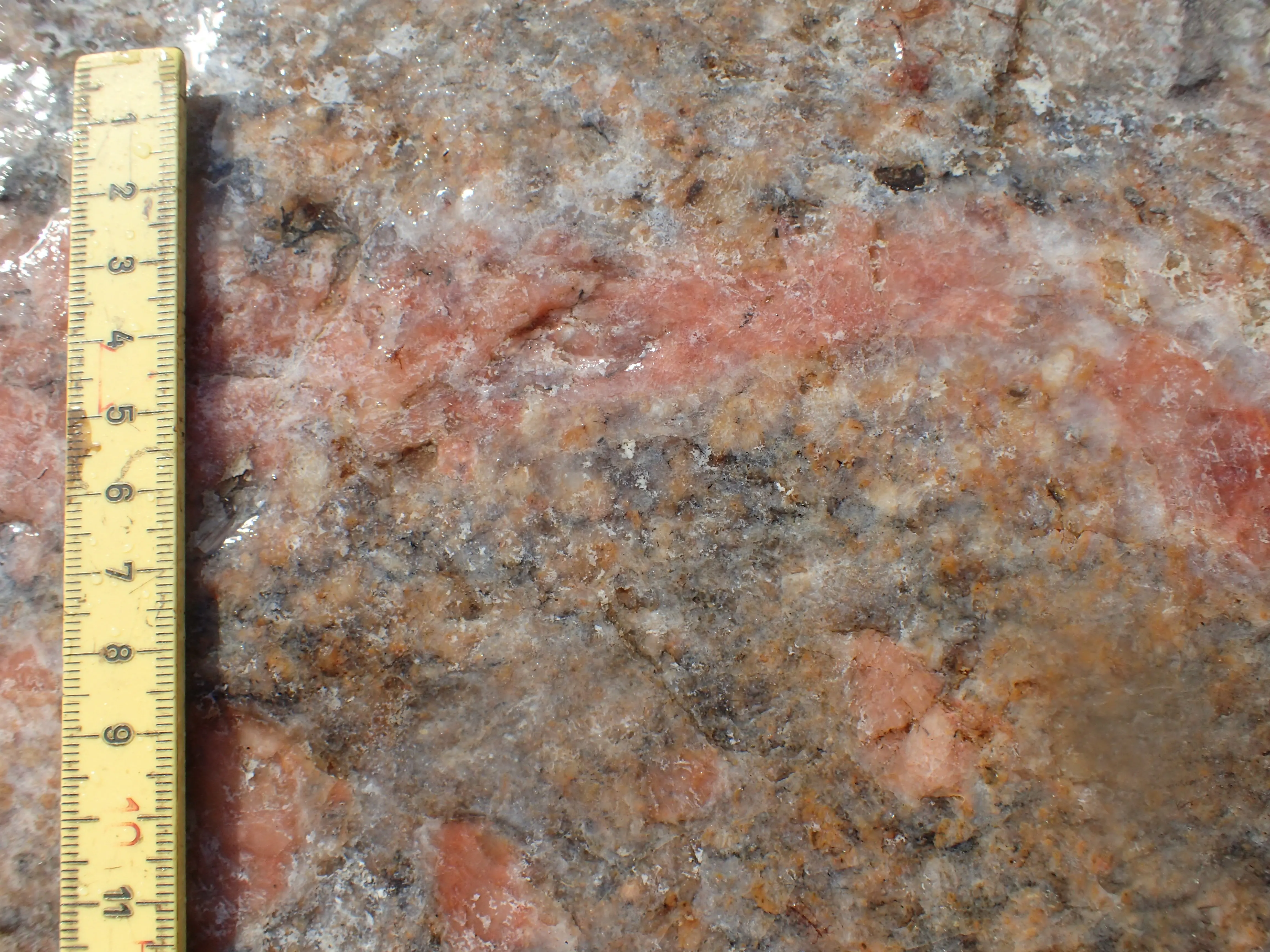 På nordsiden har overfladen form som trappetrin ned fra stenens flade ryg. Det bløde glimmermineral biotit ser ud til at ligge i sytrådtynde bånd, der adskiller de hårdere mineraler af feldspat og kvarts.