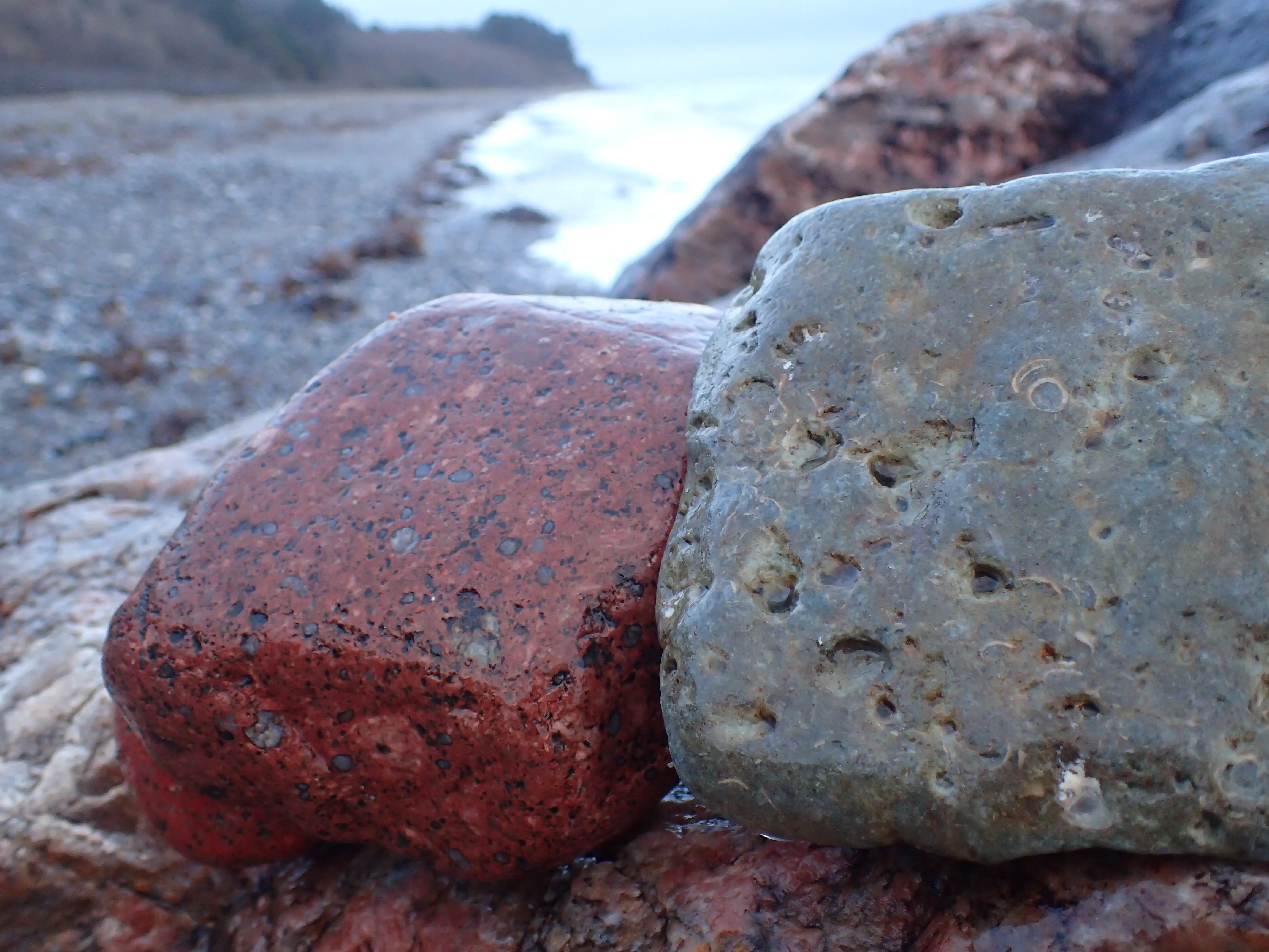 På den stenede strand under Havknudes klint finder du let ledeblokke bragt til stedet fra både nord, nordøst og sydøst vasket fri og gavmildt lagt til skue lige til at samle op. Spættet Rhombeporfyr, nupret Kinnediabas, gråstribet Skolithossandsten og højrød Rapakivi lyser op på en baggrund af afrundet flint.