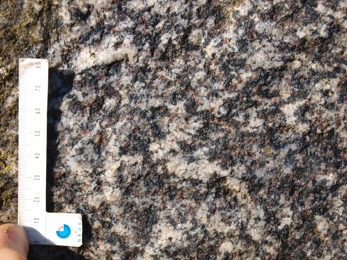 Enkelte brede pegmatitgange snor sig over stenen med hvid feldspat og kvarts, hvor kornene er omkring 5 mm store.