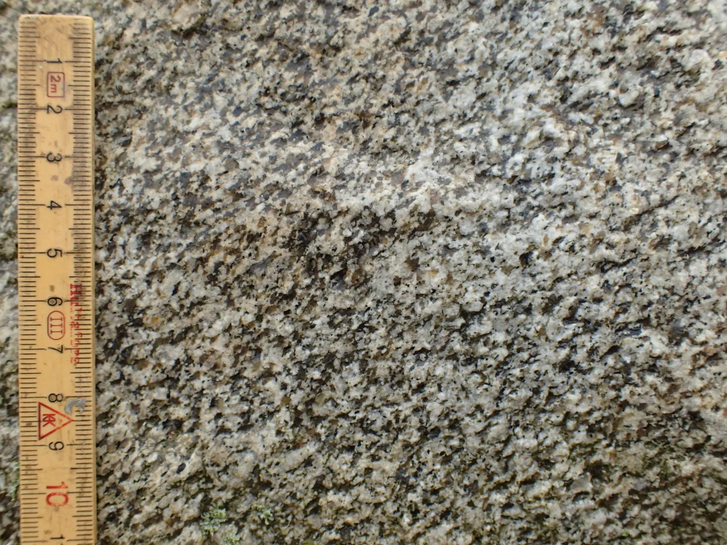 Bjergarten er meget lys og enskornet. Hovedmineralet er mælkehvid feldspat. Heri ses lys grå kvarts, hvor du aner et blåligt skær. Desuden ses brun kvarts. Størrelsen på de enkelte mineralkorn ligger mellem 2 og 3 mm, og bjergarten kaldes derfor mellemkornet. Bjergarten samlet set viser svag foliation, idet mange af mineralkornene er aflange og har samme orientering.