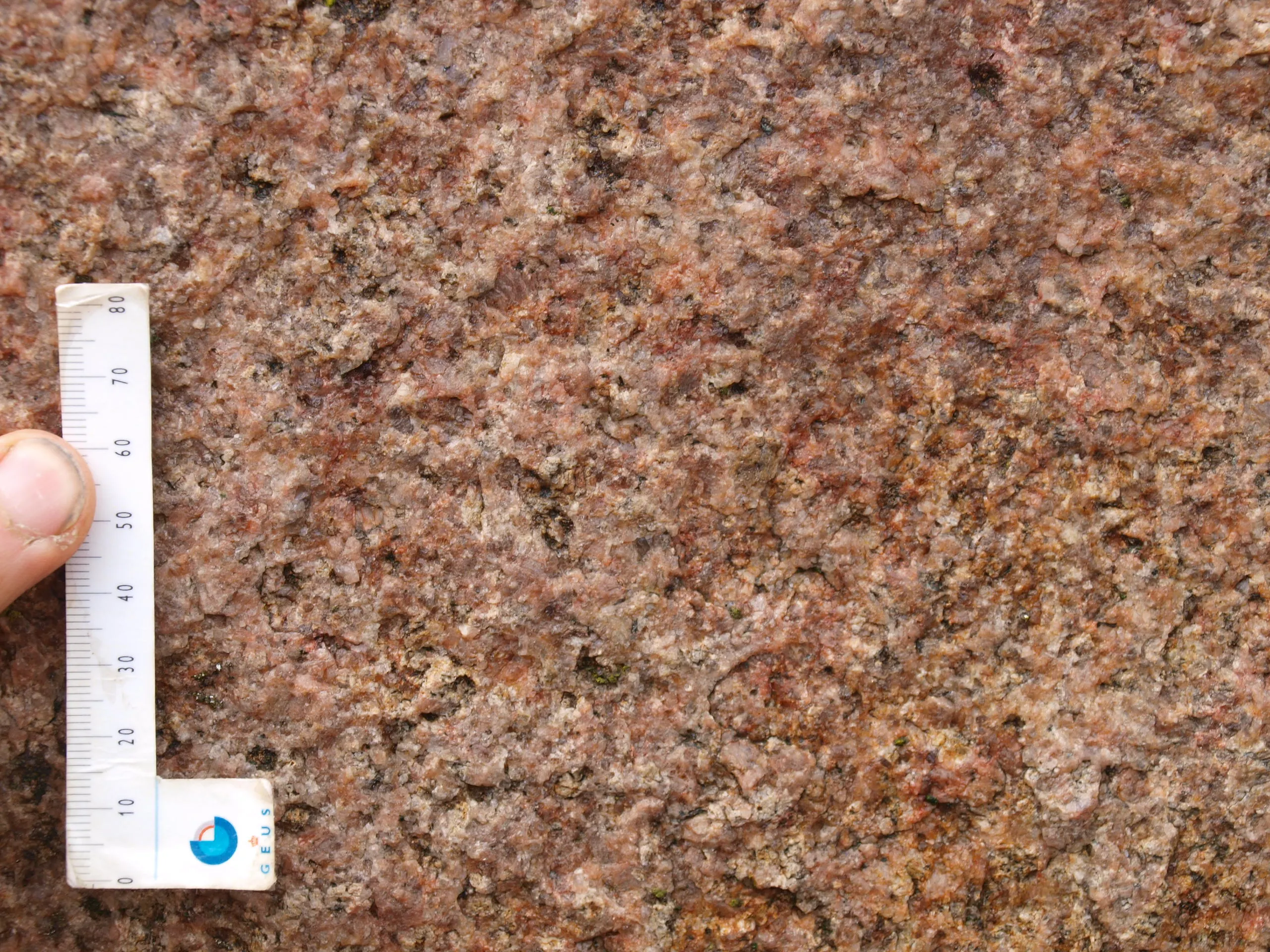 De enkelte mineralkorn fletter ind i hinanden med det, geologer populært kalder puslespilsstruktur. Det kan være svært at skelne de enkelte mineraler fra hinanden, men de er sjældent større end 5 mm, og bjergarten kaldes derfor mellemkornet. Og homogen, fordi kornene har omtrent samme størrelse.