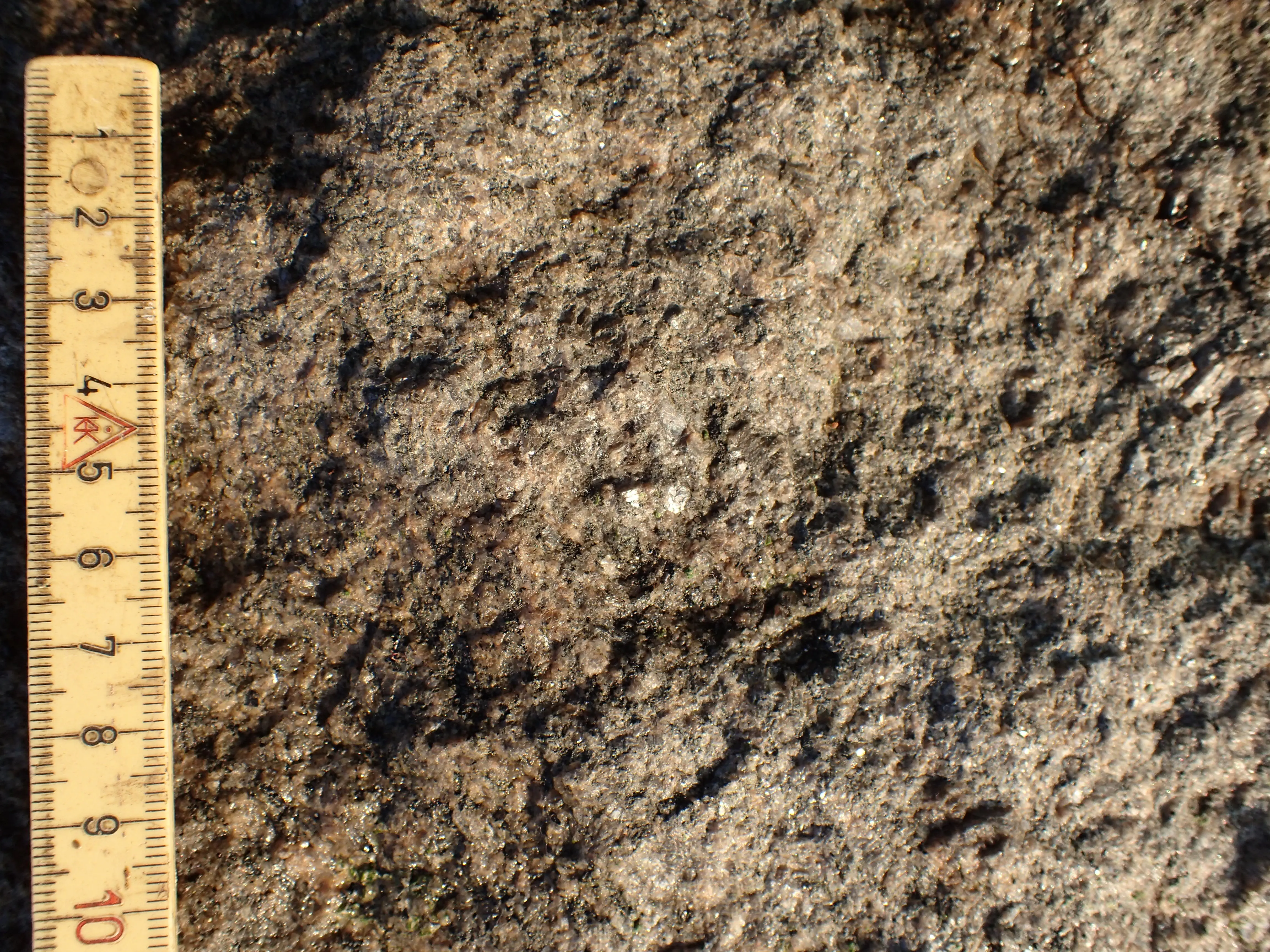 Bjergarten fremstår rødgrå med svag stribning (foliation), idet sorte mineraler danner centimeter lange næsten lodretstående striber på sydvestsiden, hvor bjergarten lettest studeres. Ligeledes på sydvestsiden ses en pegmatitgang få cm bred parallel med foliationen.