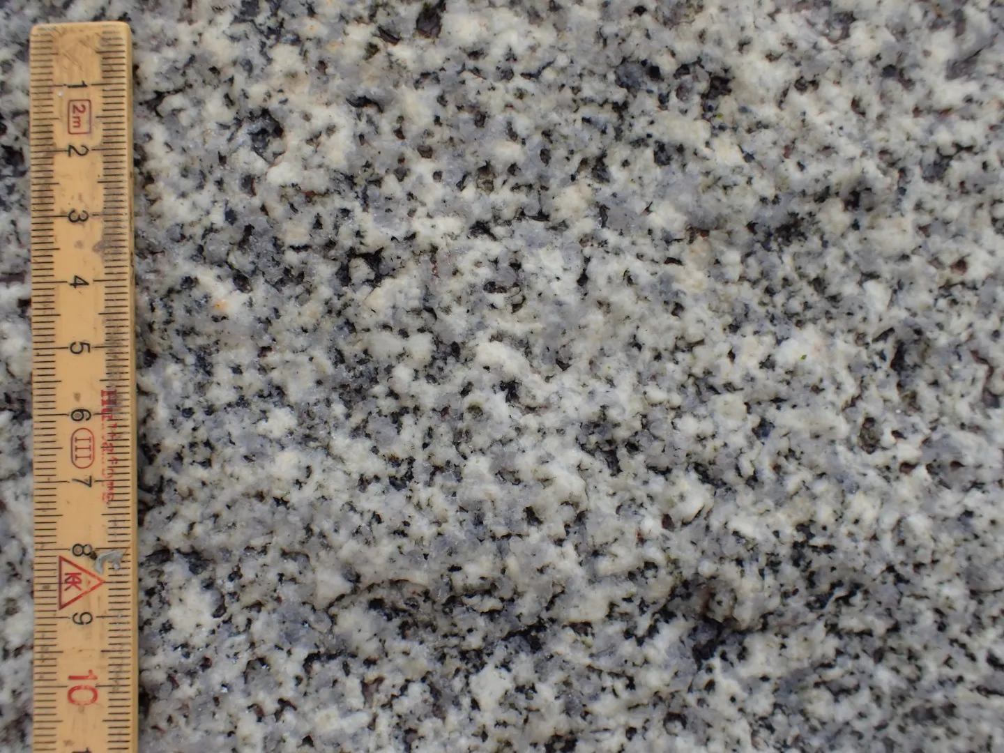 Bjergarten er meget lys og enskornet. Hovedmineralet er mælkehvid feldspat. Heri ses lys grå kvarts med et blåligt skær. Mellem det hvide og grå klemmer det sorte glimmermineral biotit sig ind og bidrager til et svagt sortspættet udseende. Størrelsen på feldspat- og kvartskorn ligger mellem 2 og 5 mm, og bjergarten kaldes derfor mellemkornet. Mineralkornene synes at støde op til hinanden langs snørklede grænser. Puslespilsmønster kaldes det.