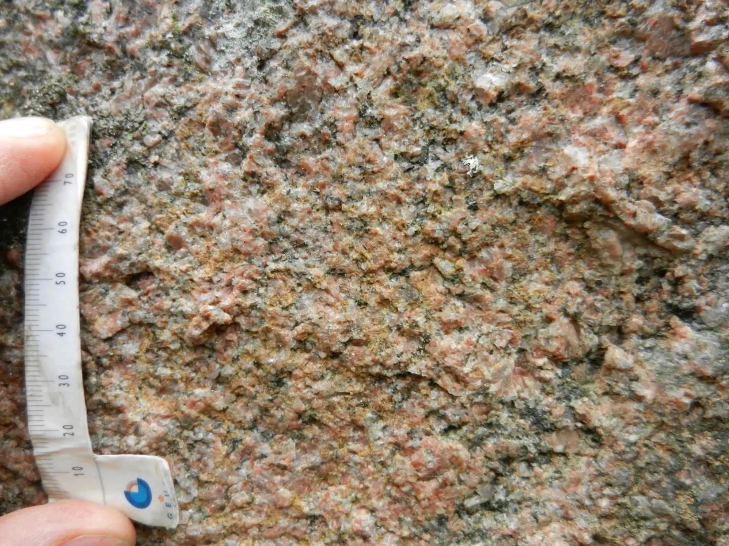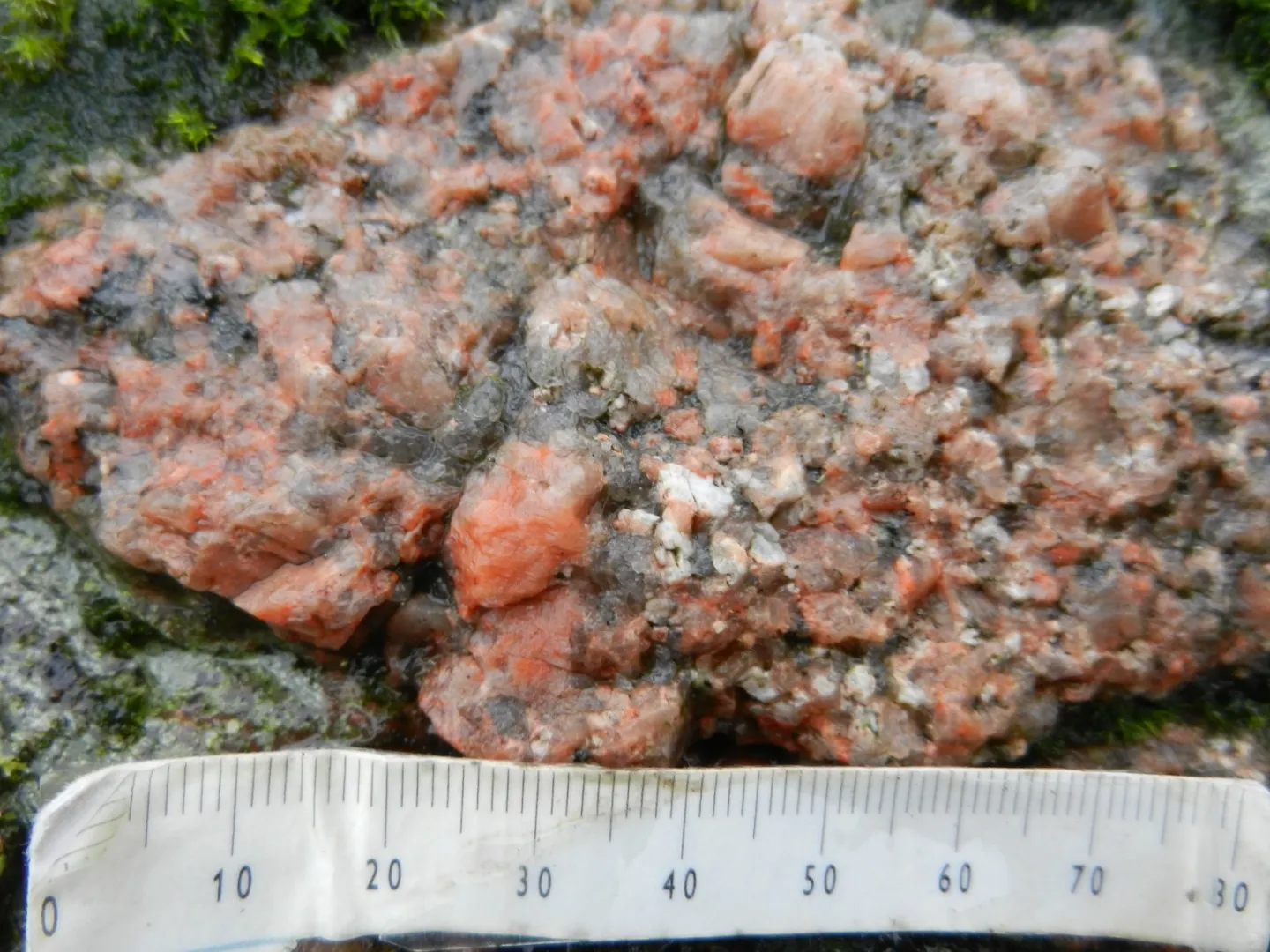 Rød kalifeldspat med lys grå til glasklar kvarts.