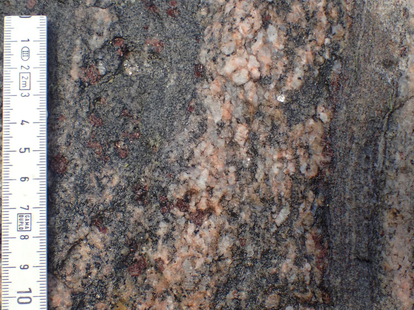 Det vinrøde højtryksmineral granat ses overalt lidt tilfældigt, men dog jævnt fordelt over stenens overflade som ærter tabt på et gulv. Granat dannes ved omkrystallisation og vokser atom for atom, når mineralerne tilpasser sig et højt tryk dybt i jordskorpen. Lommestenens granater er sandsynligvis af typen almandin, der netop er mørkt røde og desuden er den mest almindelige type.