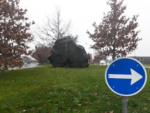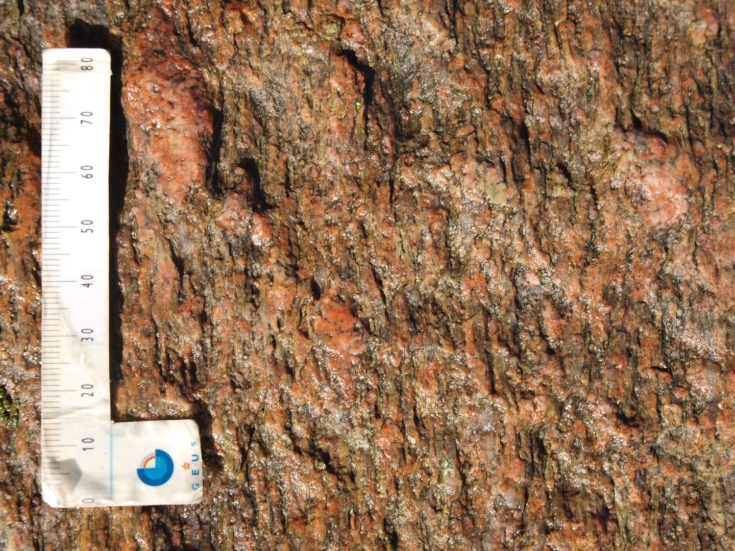 På stenens stumpe ende ses hvide årer. Det kaldes populært 'svedeslirer', og de dannes, hvis bjergarten netop når en temperatur eller et tryk, hvor dele af bjergarten smelter. Herefter samler den smeltede stenmasse sig i årer og genkrystalliserer, hvor temperatur og tryk er lavere. De lyse årer består af hvid feldspat og klar kvarts. Det sorte mineral er der foreløbig ikke navn på.
