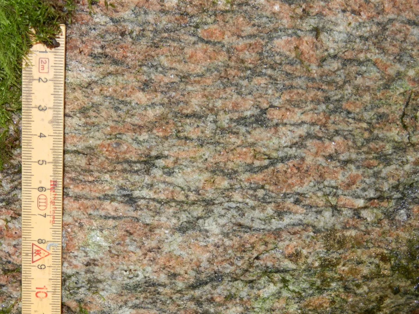 På stenens sydside (venstre side set fra skovvejen) findes en 20 x 40 cm stor aflang xenolith af finkornet lamineret amfibolit med skarp afgrænsning til den omgivende gnejs. I kontaktzonen mellem gnejs og amfibolit findes en 2 til 3 cm zone som er mere hvidlig og mindre finkornet end ellers. Amfibolitten, som også er folieret, må være ældre end gnejsen. Stumper af amfibolit har ligget i granit som rosiner i bolledej, da granitten kom under tryk dybt i jordskorpen og blev omdannet til gnejs. To deformationsbegivenheder skal der derfor til, for at forklare de to bjergarters udseende: Først amfibolittens, siden gnejsens.