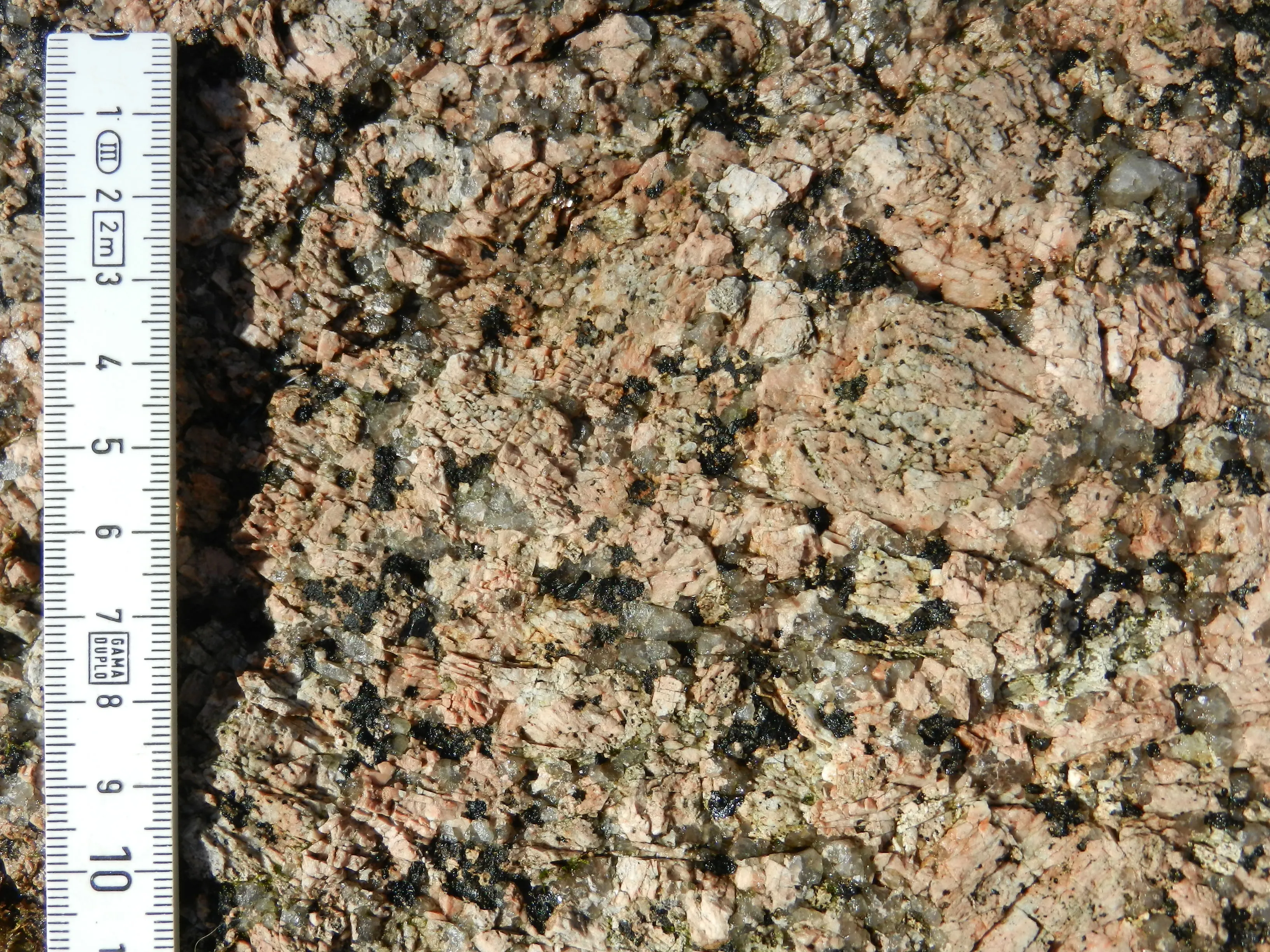 På trods af mosdække ses en meget grovkornet bjergart med kantede, indimellem rektangulære og enkelte steder helt kvadratiske korn. Lyse rosa kalifeldspatkorn op til 3 cm store dominerer bjergarten. Herimellem ses hvide plagioklaskorn 1,0 til 1,5 cm. Enkelte steder anes ringformede strukturer, hvor rosa omkranser gråhvid. Korn af grå kvarts omkring 0,5 cm store snor sig som kæder mellem de større feldspatkrystaller. Spredt findes hobe af sorte glinsende mineraler, der antagelig er biotit og måske hornblende.