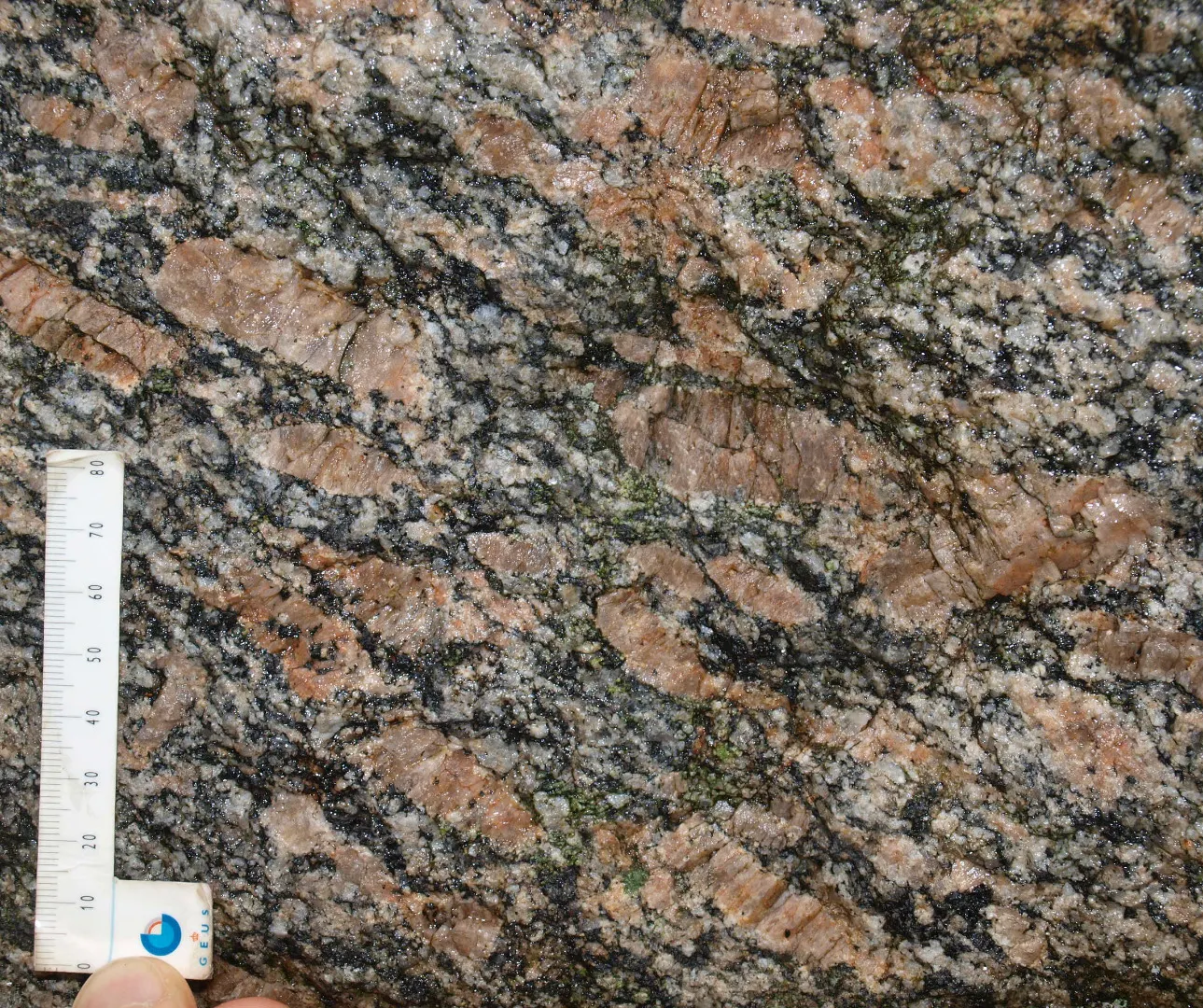 Tirslundstenen består af gnejsgranit med aflange rødbrune kalifeldspatkrystaller, der er tydeligt ensrettede. Krystallerne er typisk 5-6 cm lange og 1-2 cm brede og ofte med karlsbadtvillinger. Herimellem findes kvarts og lys plagioklas. De sorte mineraler er sandsynligvis hornblende.
