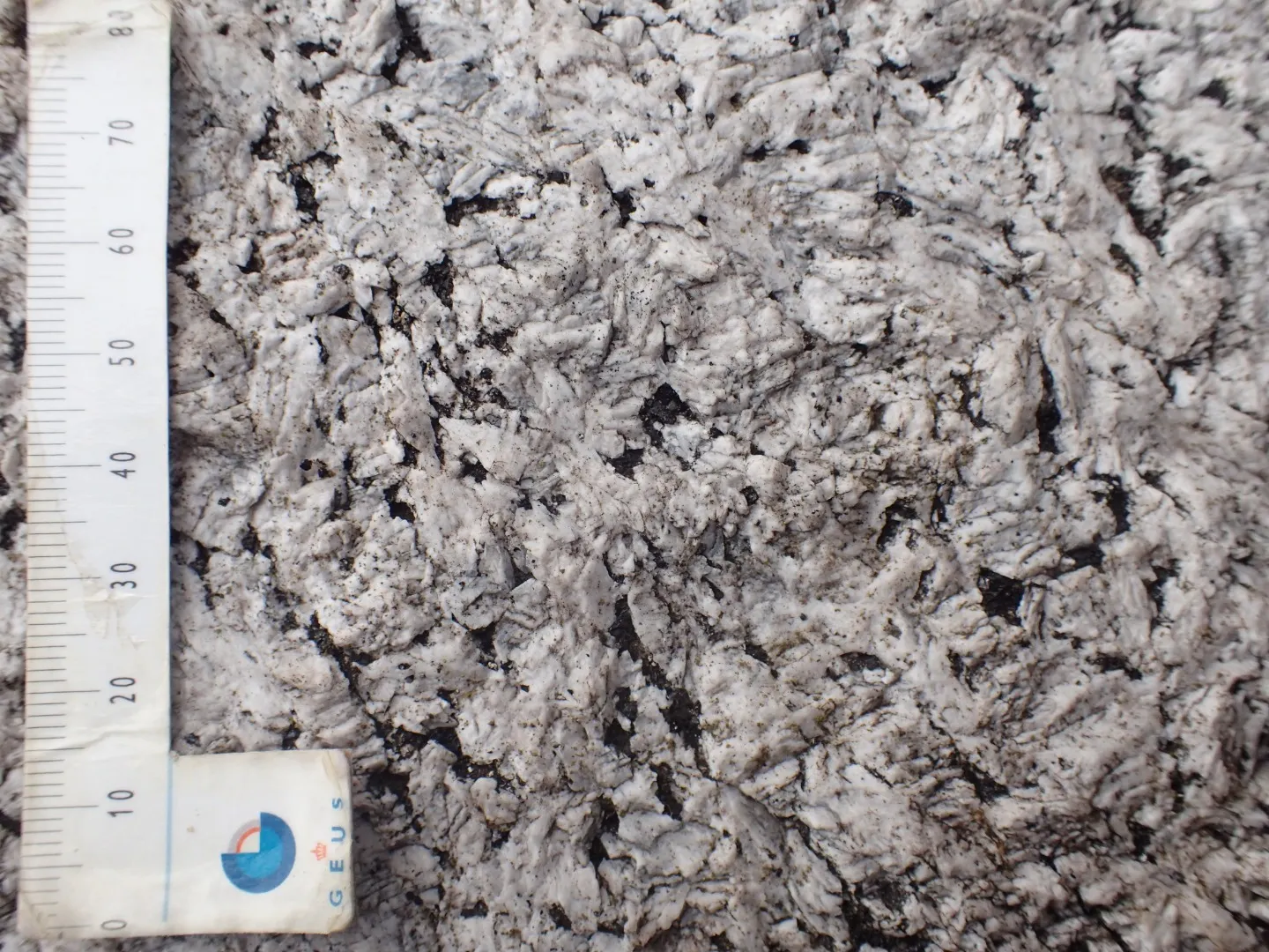 Bjergarten er grovkornet og hvid på overfladen. Et enkelt sted ses et frisk brud, der afslører, at bjergarten er lys grå under den forvitrede overflade. Mange af mineralkornene er aflange, typisk 1,5 cm brede og 4 cm lange. Imellem det hvide sidder sorte 2 til 5 mm store mineralhobe.