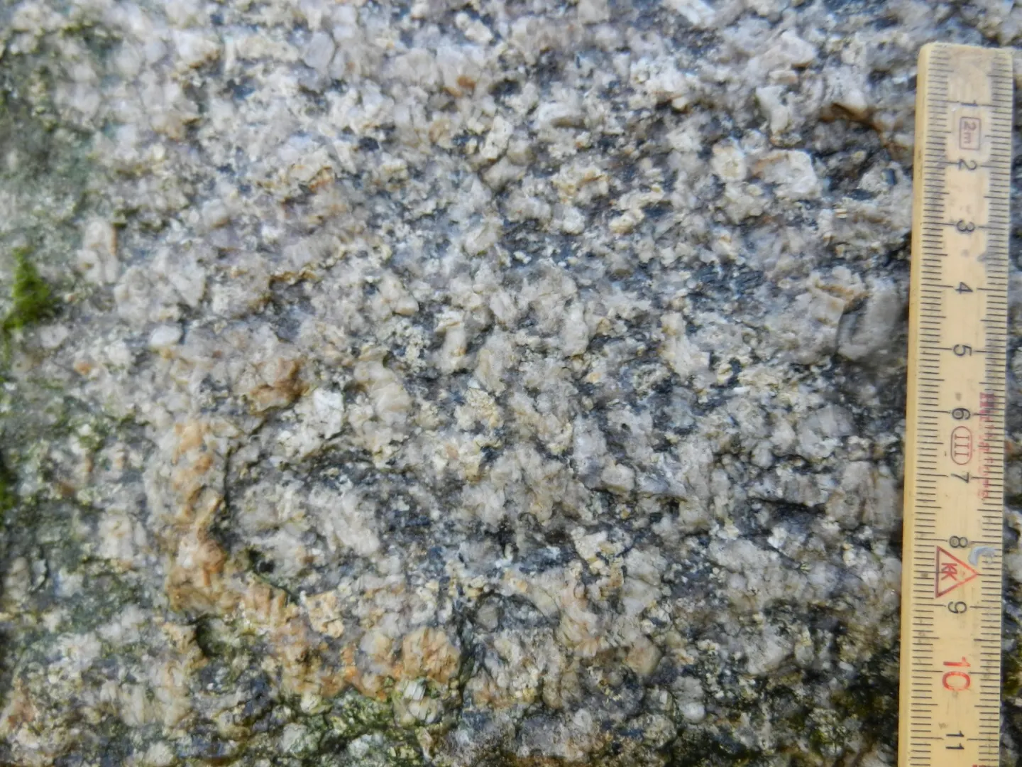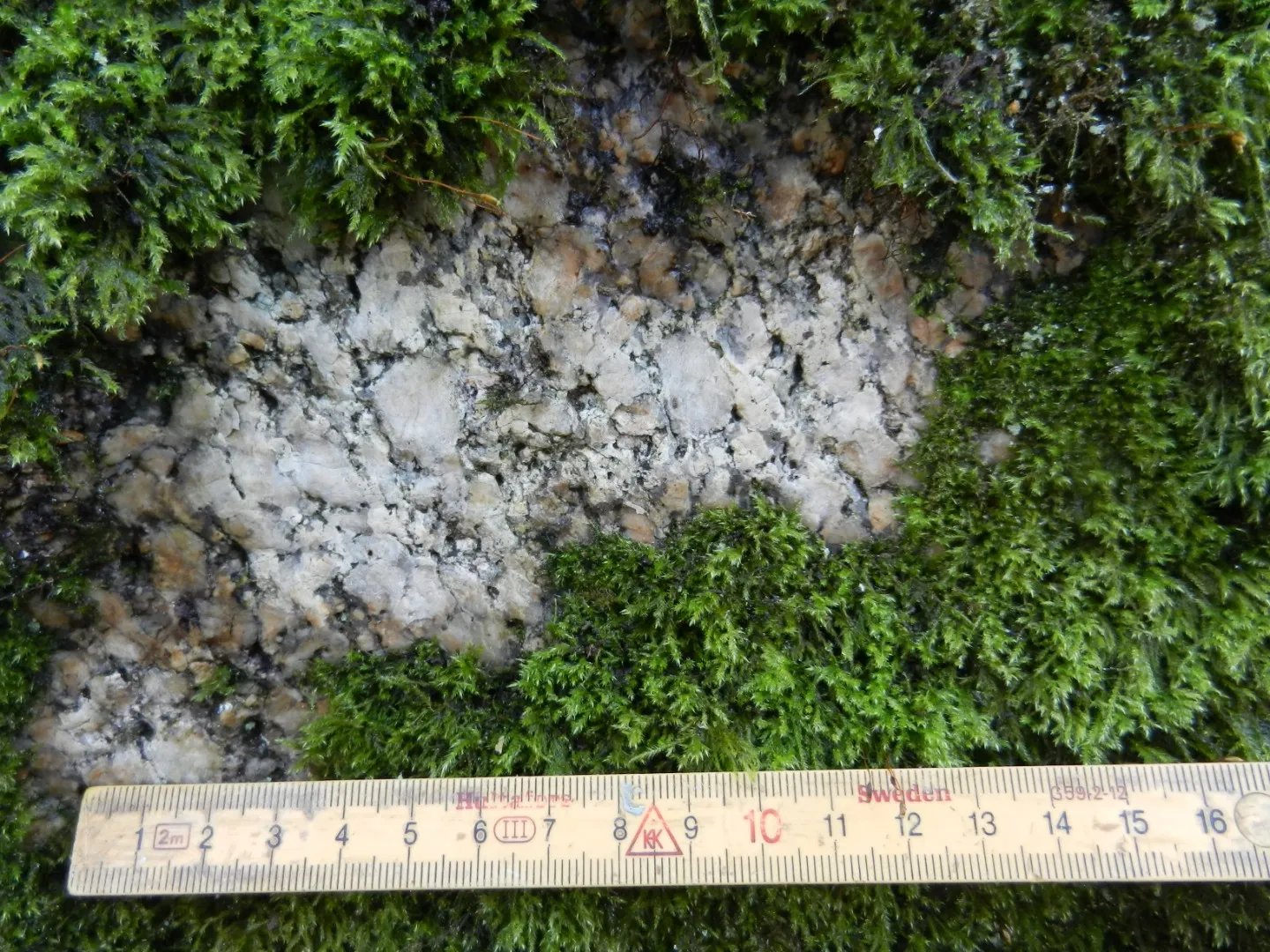 På de to lodrette endeflader ser bjergarten anderledes ud. Der ser du rødlig feldspat, som nærmest er moset ud til 10 til 15 mm plamager. Der kan muligvis være tale om omdannede mineraler langs sprækker i bjergarten, hvorigennem der har flydt varme væsker på et tidspunkt, der hvor stenen stadig var en del af grundfjeldet dybt i jordskorpen. Der er muligvis tale om en Smålandsgranit.