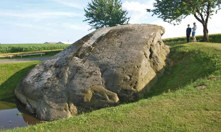 Ledeblokke, kalder vi sten, vi ved, hvorfra kommer. Vi kender altså stedet, hvor stenen findes som fast fjeld. Rombeporfyren er et af de bedste eksempler på en ledeblok. Bjergarten findes faststående ved Oslofjorden, så når vi finder den på en Nordjysk strand, må den have rejst med indlandsisen fra Oslofjorden til Nordjylland. Der er ingen rombeporfyrer blandt Danmarks kæmpesten. Derimod består en håndfuld kæmpesten i Nordjylland af Larvikit, der findes som fast fjeld ved Larvik ikke så langt fra Oslofjorden.