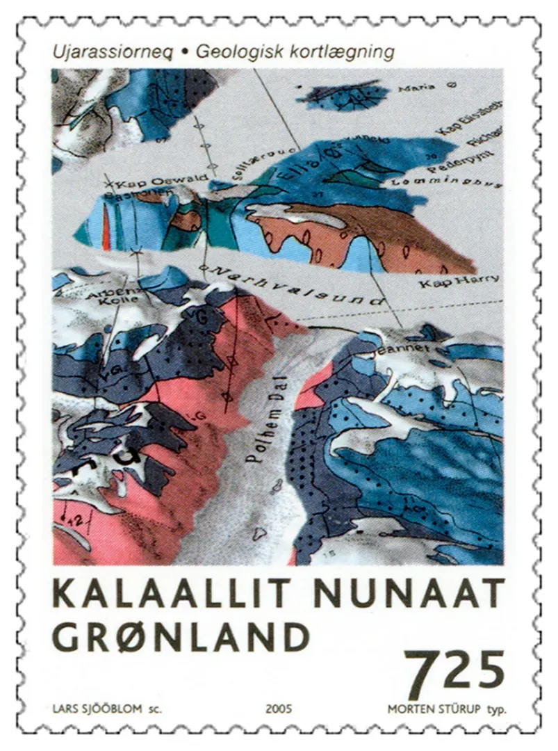 Frimærke udgivet af det Grønlandske Postvæsen i 2004 i anledning af at GEUS blev færdig med den overordnede geologiske kortlægning af Grønland efter 40 års arbejde.