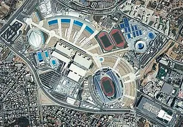 Et satellitbillede af den olympiske by og det olympiske stadion i Athen brugt til OL i 2004. Billedet er taget fra Ikonos-satellitten. Kilde: CRISP, National University of Singapore, 2004
