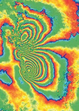Landforskydningerne beregnet med radarinterferometri fra Envisat-satellitten ved jordskælvet i Bam. Hvert gennemløb af farveskalaen (blå-grøn-gul-rød og tilbage til blå) svarer til, at jordskælvet har forskudt jordoverfladen med 28 mm. Det vil sige, at jo smallere striberne er, desto større forskydning. Man kan altså måle forskydninger på nogle få millimeter fra en satellit, der kredser i 700 km´s højde. Kilde: ESA og GeoForschungsZenter, Postdam, Tyskland