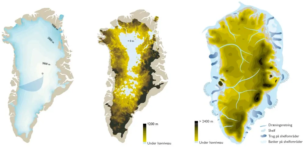 Til højre: Grønland uden det nuværende isdække og med højden af landskabet korrigeret for belastningen fra isdækket. Store dele af det centrale Grønland drænes via store floder mod Disko Bugt i Vestgrønland. Fortsættelsen af den gamle dræning af indlandet ses som submarine trug ud for Grønlands kyster.