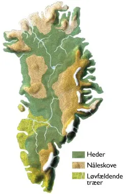 For omkring 2,4 millioner år siden dækkede skove med lærk, gran og birk det meste af Grønland, mens der fandtes heder på højtliggende fjeldområder. Illustration: S. Funder, Geologisk Museum København