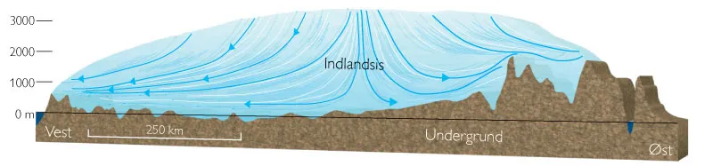Snit tværs gennem Grønland, der viser Indlandsisens tykkelse. I de centrale dele overstiger tykkelsen 3 km. Bemærk at de dybeste dele ligger under havniveau. Flydelinjerne angiver, hvordan isen bevæger sig fra de indre dele ud mod randen. Illustration: Carsten E. Thuesen, GEUS.