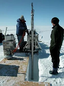 Letvægtsbor til korte kerner fra Nord-GRIP i Nordgrønland. En dyb boring ved Nord-GRIP nåede bunden i 2003. Iskernen fra den dybe boring er 3085 meter lang og rækker ca.120.000 år tilbage i tiden. Kilde: Ukendt