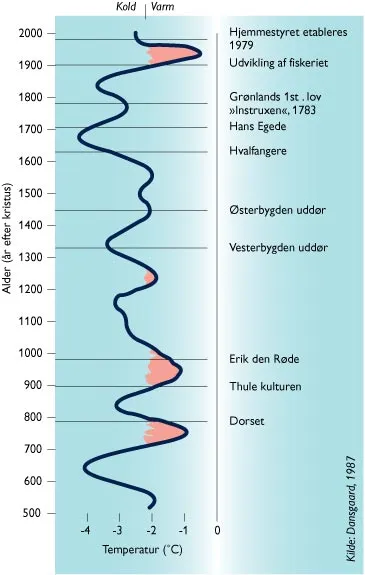 Klimakurve for de sidste 1500 år; vigtige begivenheder i Grønlands historie er markeret. Kilde: Dansgaard, 1987