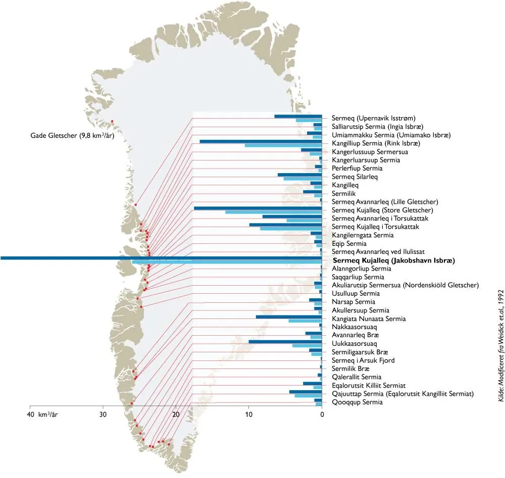 Anslået maksimum (mørkeblå) og minimum (lyseblå) kalvisproduktion fra isstrømme langs vestkysten af Grønland. Sermeq Kujalleqs produktion af kalvis er i særklasse. Kilde: Sohn. et. al. 1997.