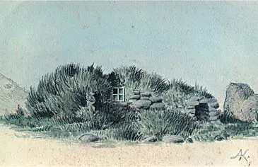 Traditionelt vinterhus fra Thule-kulturen moderniseret med et glasvindue. Kilde: A. Kornerup, 1876