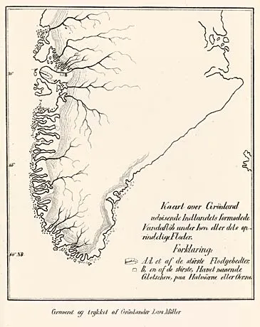 Kortet viser Rinks teori fra 1862 om dræning via floder fra indlandet. Kortlægningen på den tid var ikke særlig præcis. Dette gælder især for Grønlands østkyst og for egnen nord for Ilulissat på vestkysten. Kilde: H. Rink, 1857