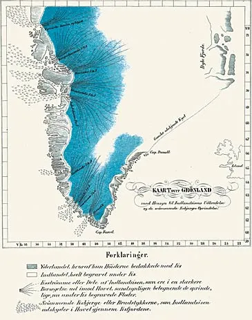 Rinks fremstillede i 1857 dette kort, som viser Indlandsisens udbredelse og isstrømme fra Indlandsisen, som udmunder i Disko Bugt og længere nordpå. De fem store isstrømme, som udmunder i Disko Bugt og længere nordpå, er vist sammen med mindre isstrømme i det sydlige Grønland. Kilde: H. Rink, 1862