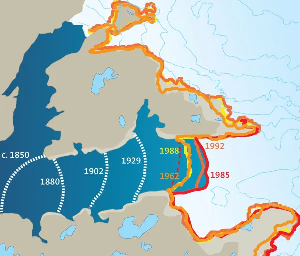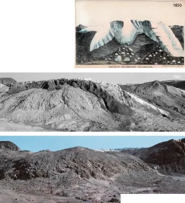 En af glaciologiens store pionerer, Hinrich Rink, tegnede i 1850 Indlandsisens rand ved Paakitsoq nord for Kangia. Dengang rykkede isranden frem, og isen nåede sin maksimale udbredelse på stedet omkring 1880. Siden er der sket en gradvis tilbagetrækning, hvilket fremgår af billederne fra 1961 og 1987. Kilde: H. Rink, Anker Weidich, Henrik Højmark