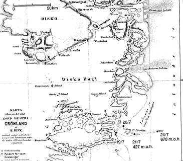 Kort over Nordenskiölds isvandring, 1870, syd for Ilulissat Isfjord. Tegnet af Hinrich Rink. (Kilde: 'Horisonter af Is' af Rud Kjems)