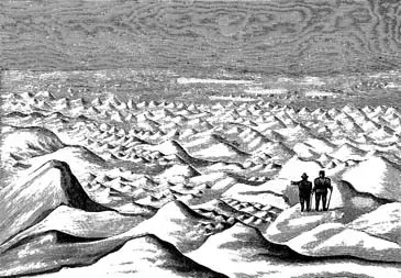 Tegning fra Indlandsisen af S. Berggren under Nordenskiölds isvandring 1870. (Kilde: Horisonter af Is. Af Rud Kjems)