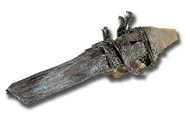 En 3500 år gammel stikkel fra Saqqaqkulturen, som blev fundet på Qajaa. Flintbladet er hæftet til et træskaft med en surring af hvalbarde. Stikler blev brugt til spaltning af ben og træ. Foto: Erik Holm