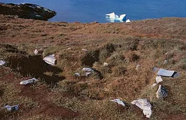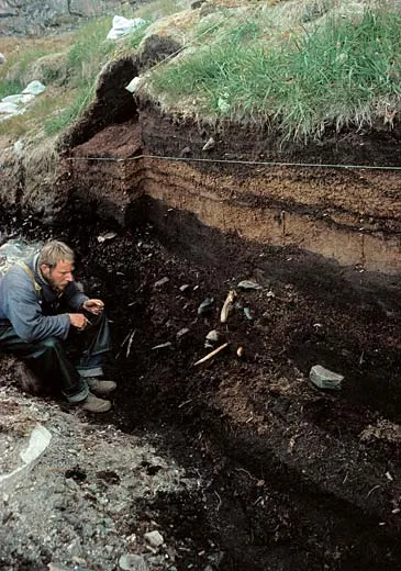 Arkæologisk udgravning ved Qajaa. Lagene i køkkenmøddingen stammer fra Saqqaq-, Dorset- og Thulekulturerne. Foto: Jørgen Meldgaard