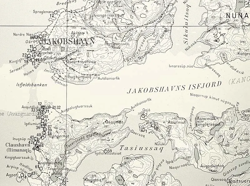 Bopladser er markeret med cirkler. Ingen andre stenalderbopladser i Vestgrønland er så store eller vigtige som Sermermiut på nordsiden af isfjorden nær ved mundingen og Qajaa på sydsiden 25 kilometer inde i fjorden. Da Thulefolket omkring år 1200 slog sig ned ved Kangia, bosatte de sig også ved Sermermiut og Qajaa. Kilde: Grønlands Nationalmuseum i Nuuk.